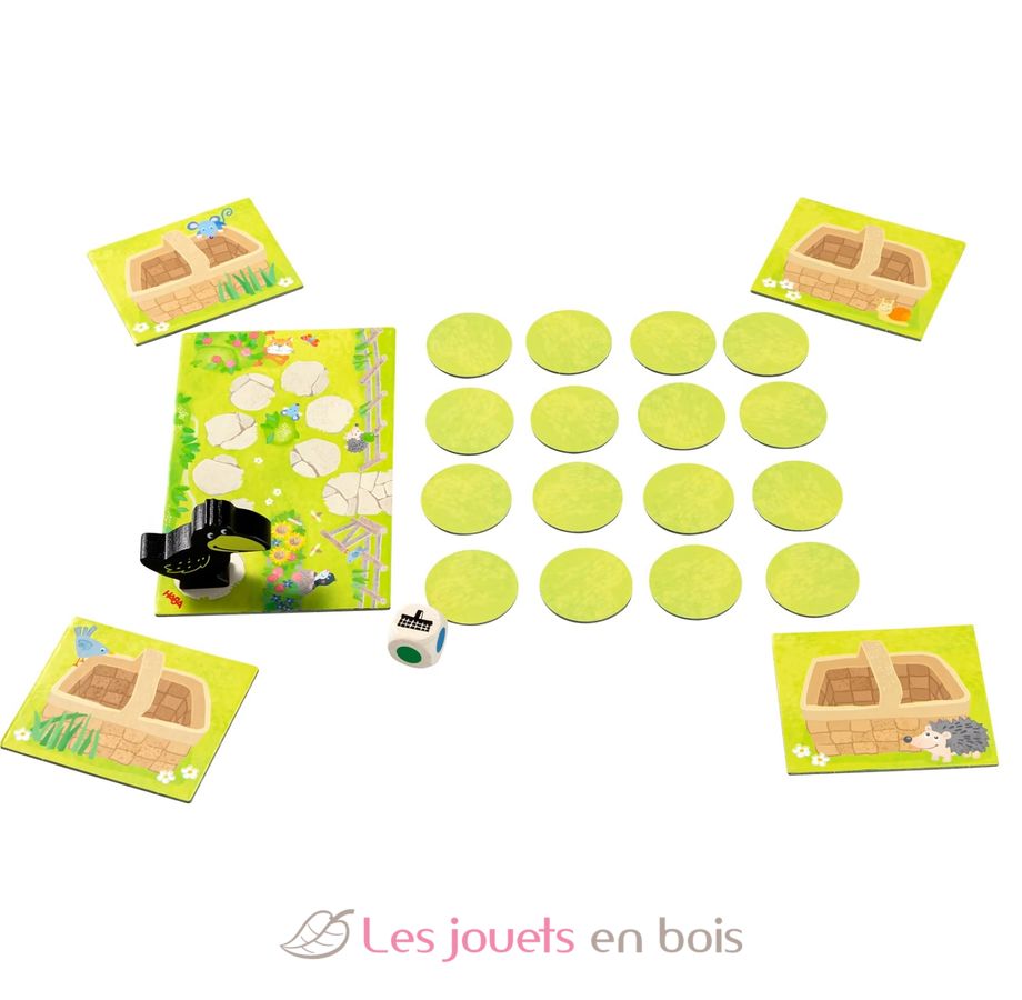 Obstgarten – Das Memospiel von HABA ist eine tolle Abwandlung des Spieleklassikers Obstgarten. Früchte dürfen nur geerntet werden, wenn sich auf dem aufgedeckten Obstplättchen eine Frucht, passende zur gewürfelten Farbe befindet. Aber Achtung, zeigt der Würfel den Raben Theo, darf sich dieser um ein Feld weiter zum Obstgarten bewegen. Schaffen es die Kinder alle Plättchen aufzudecken und damit alle Früchte zu ernten, bevor der diebische Rabe den Garten erreicht? Das tolle Memospiel fördert neben dem ersten Erkennen und Zuordnen von Farben auch die Merk- und Konzentrationsfähigkeit der Spieler. Und in der kooperativen Spielvariante, bei der die Kinder gemeinsam gegen den frechen Raben Theo antreten, wird die Teamfähigkeit gestärkt.