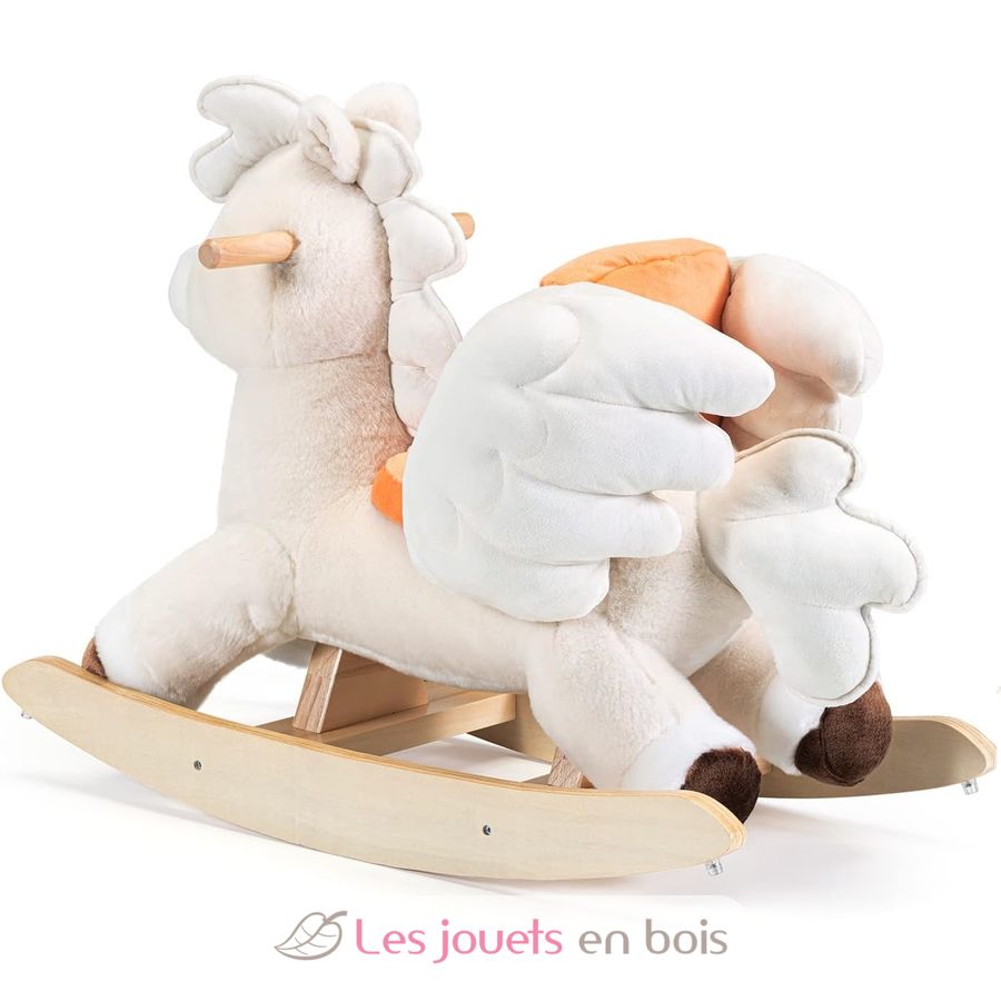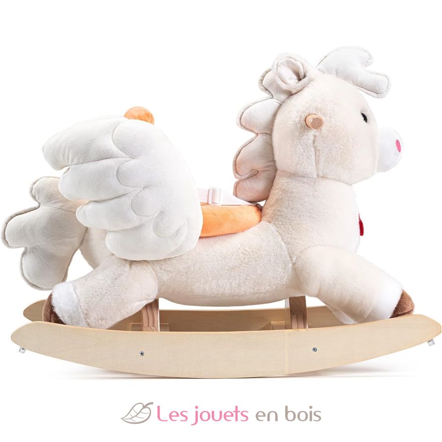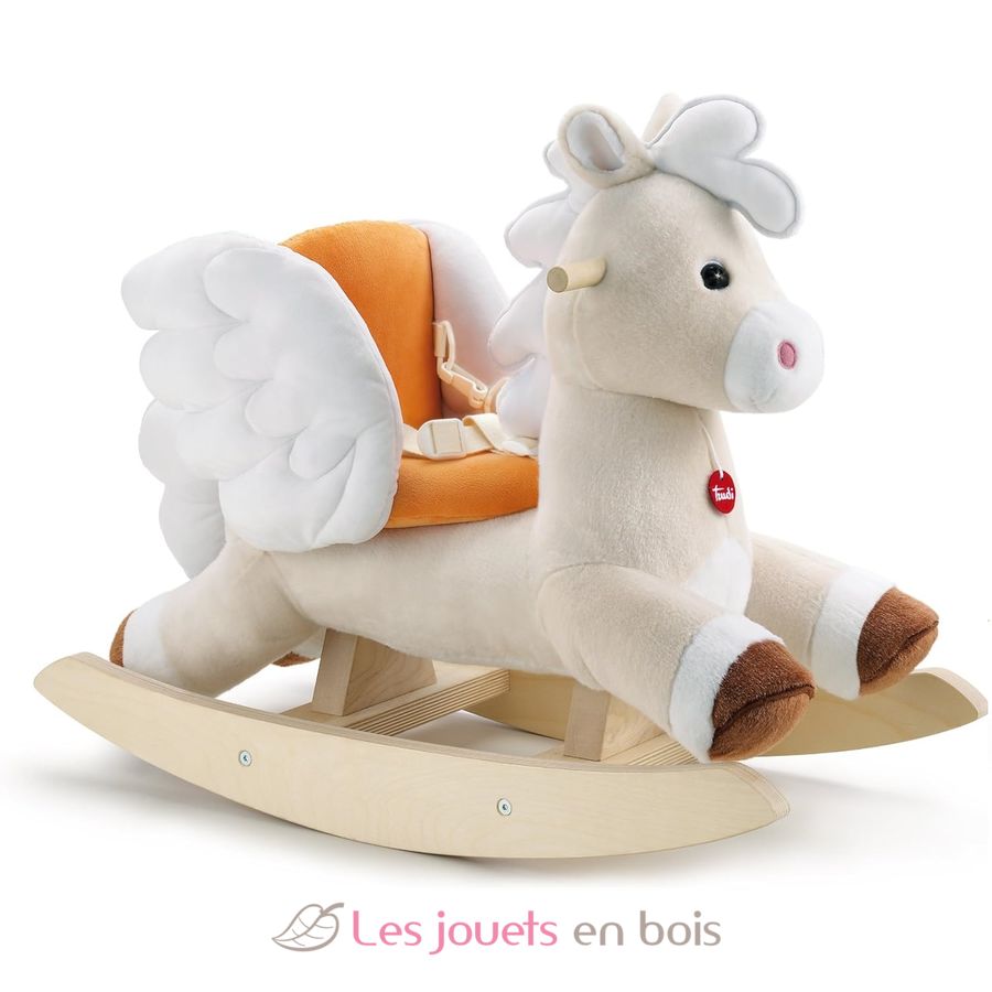 Dieses Schaukelpferd mit Rückenlehne und Sicherheitsgurt ist für Kinder ab 9 Monaten geeignet.