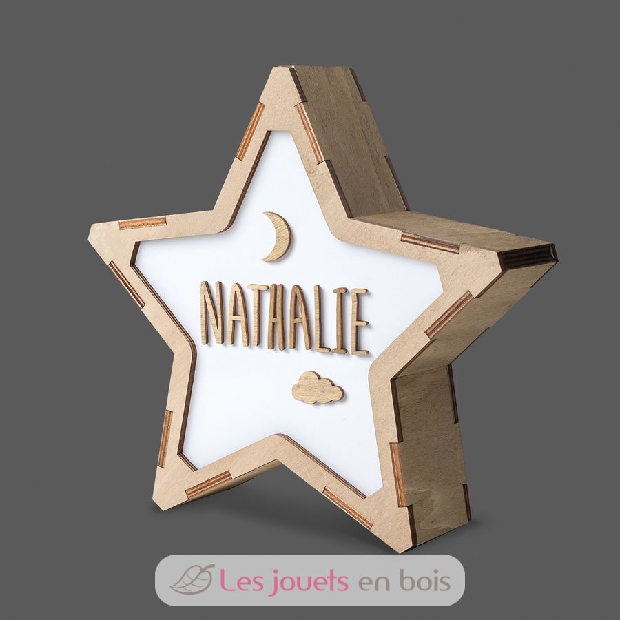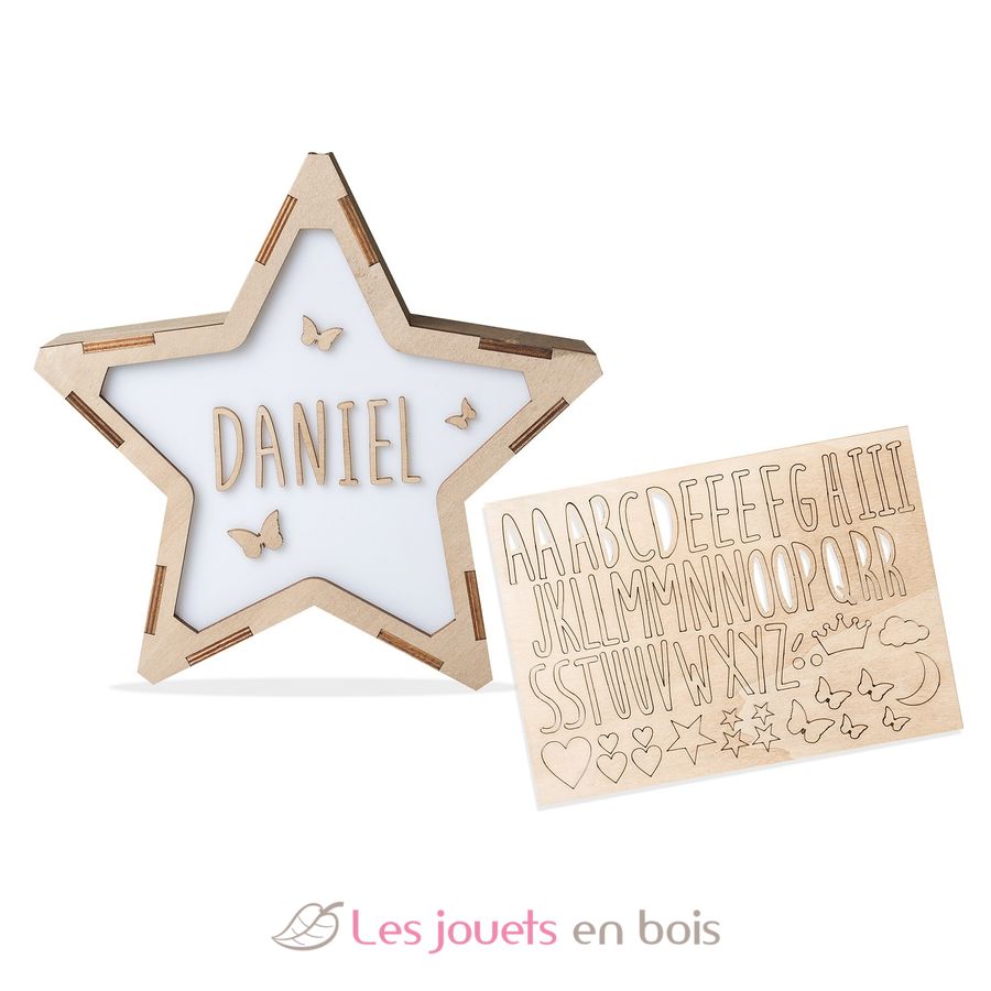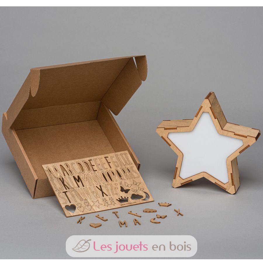 Das Set enthält: 1 Leuchtstern aus Holz und Methacrylat mit LED-Beleuchtung; 1 Bogen mit selbstklebenden Holzbuchstaben und -symbolen.