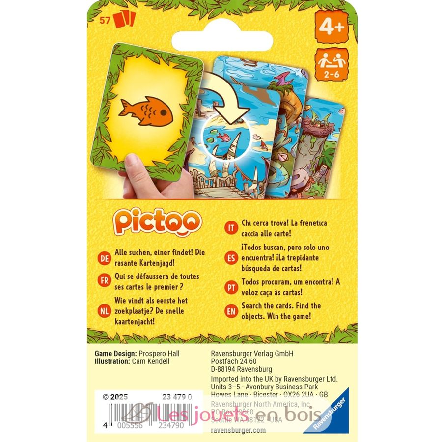 Das Ziel ist ganz einfach: Der erste Spieler, der seine 5 Karten loswird, gewinnt. Nach ein paar Spielen und wenn die Kinder mit den verschiedenen Elementen vertraut sind, können sie sogar alleine spielen, ohne dass ein Erwachsener dabei ist! Dank seiner Taschengröße kann Pictoo überallhin mitgenommen werden!