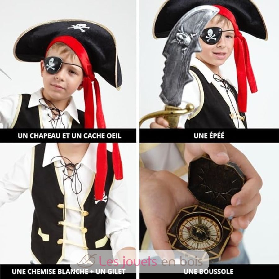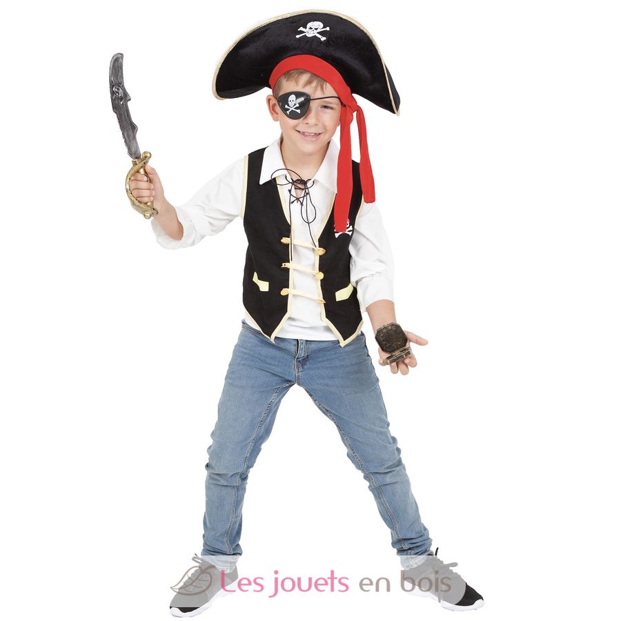 Das Kinderkostüm besteht aus einer schwarzen Piratenweste, einem Schwert, einer Augenklappe, einem Kompass und einem Piratenhut.