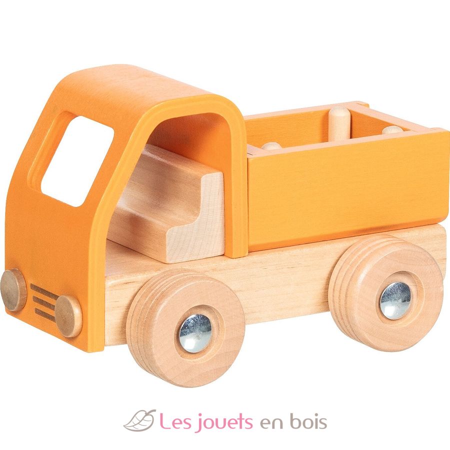 Pritschenwagen orange, Holzfahrzeuge der Marke Goki.