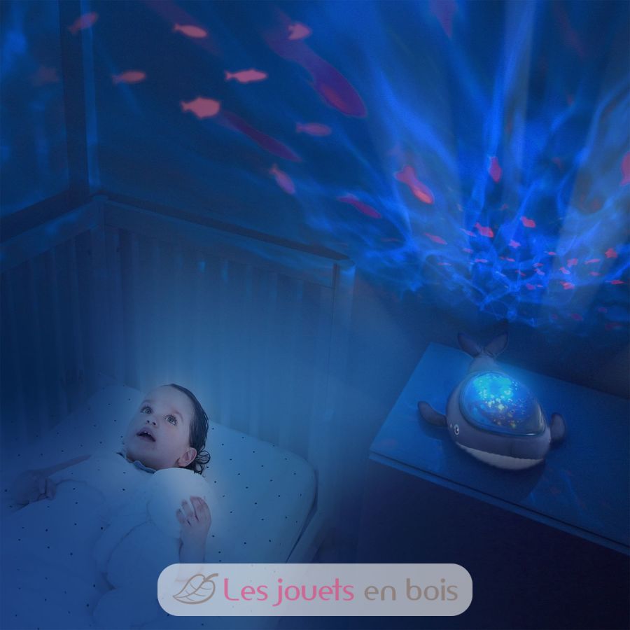 Die weiche Wal Aqua Dream projiziert Wellen und kleine orangefarbene Fische, die sich bewegen, damit Ihr Kind ruhig schlafen kann.