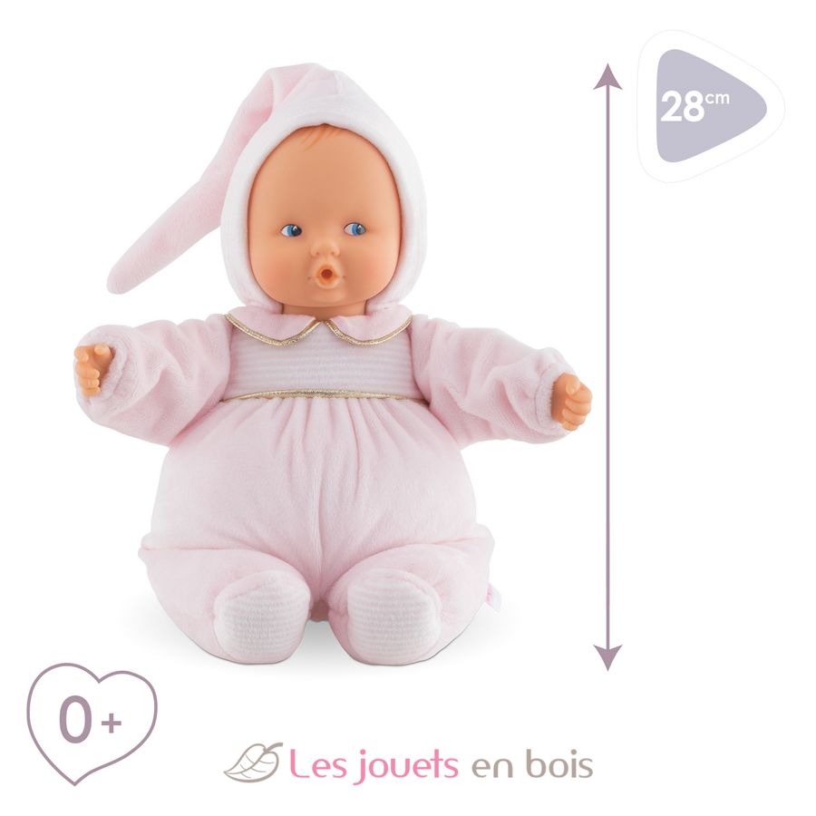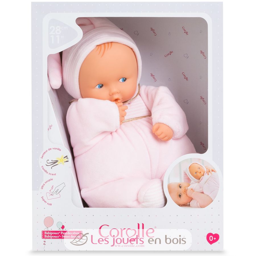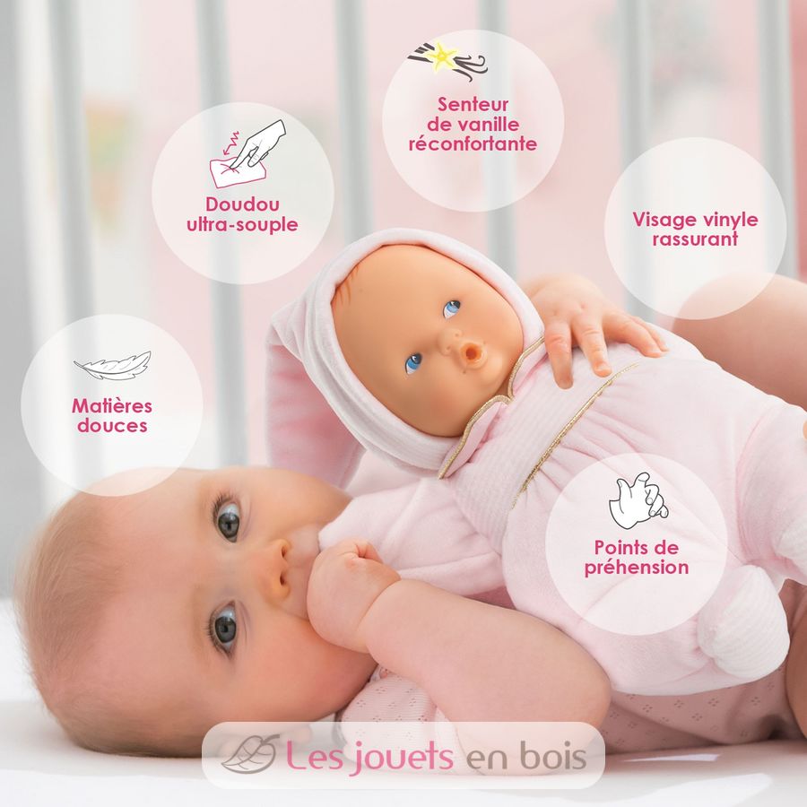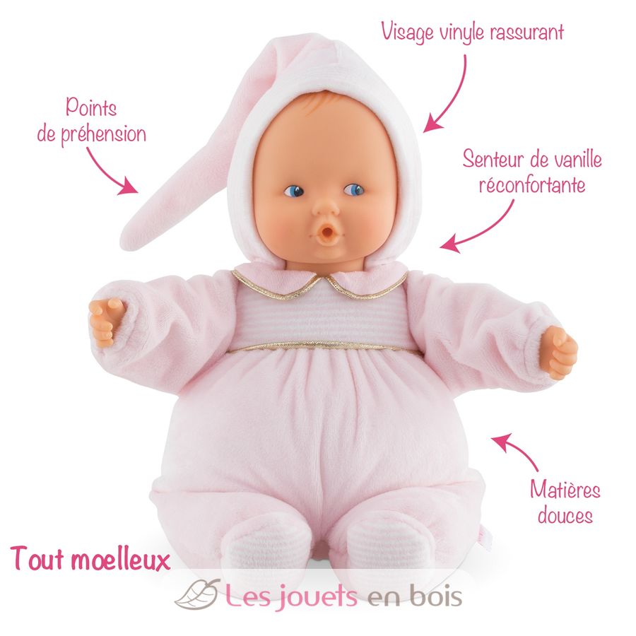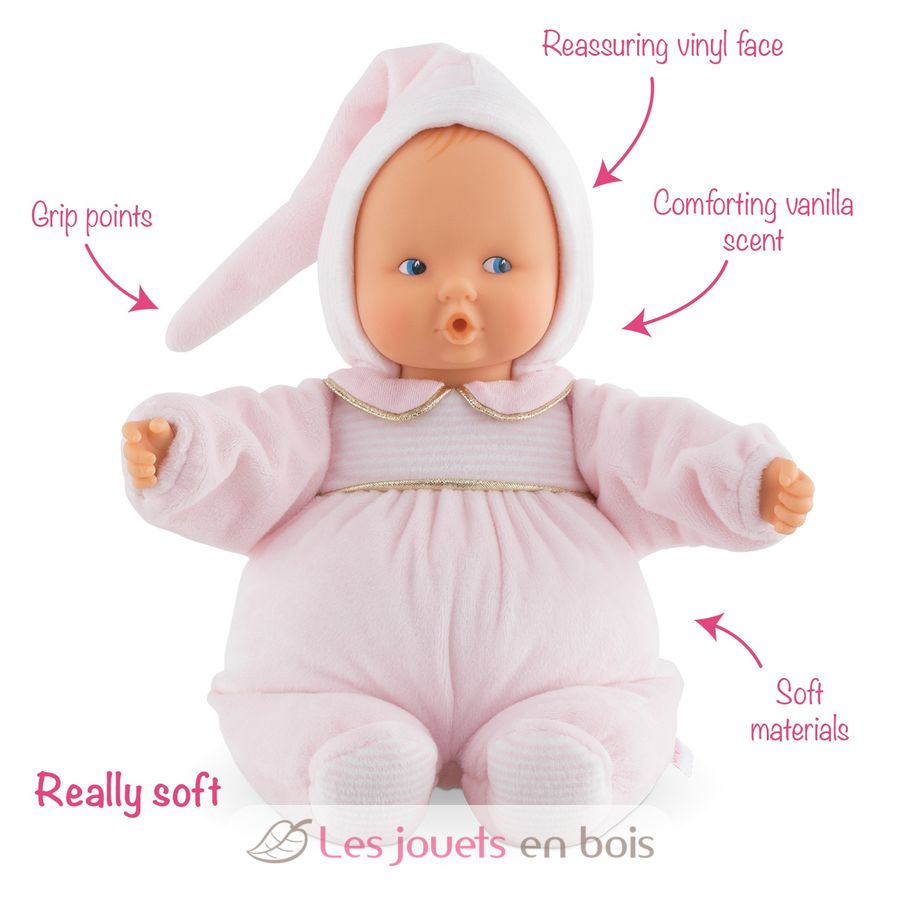 Die weiche Puppe, die Sie überallhin mitnehmen können. Beruhigendes Vinyl-Gesicht. Flexibler Körper. Wohltuender Vanilleduft. Von Geburt an.
