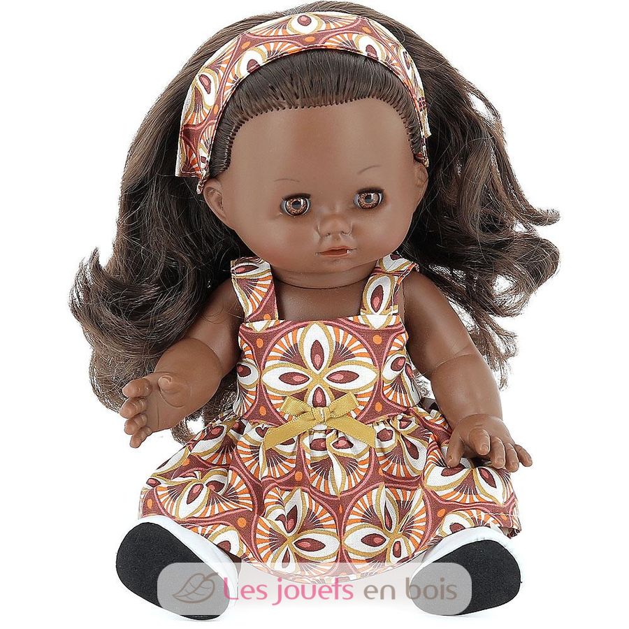 Diese Puppe wird vollständig aus weichem, duftendem Vinyl in der Petitcollin-Werkstatt in Étain, Frankreich, hergestellt. Diese Puppe hat schläfrige braune Augen mit Wimpern und lange braune Haare. Ihr Outfit besteht aus einem hübschen bunten Kleid, das zu ihrer Schleife in ihrem Haar passt.