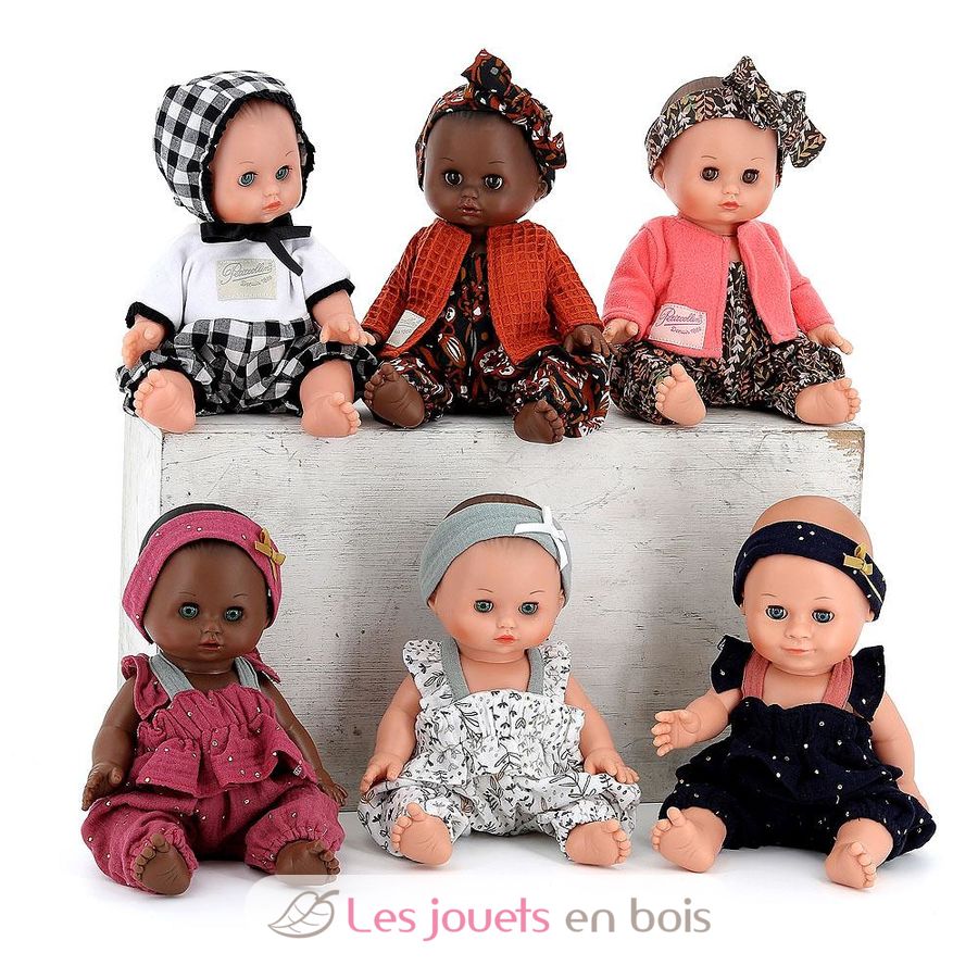 Diese Puppe wird vollständig aus weichem, duftendem Vinyl in der Petitcollin-Werkstatt in Étain, Frankreich, hergestellt. Diese Puppe hat schläfrige braune Augen mit Wimpern und schwarz gefärbtes Haar. Ihr Outfit besteht aus einem niedlich gemusterten Overall mit einer rostfarbenen Weste und einem Stirnband, das zu ihrem Outfit passt.