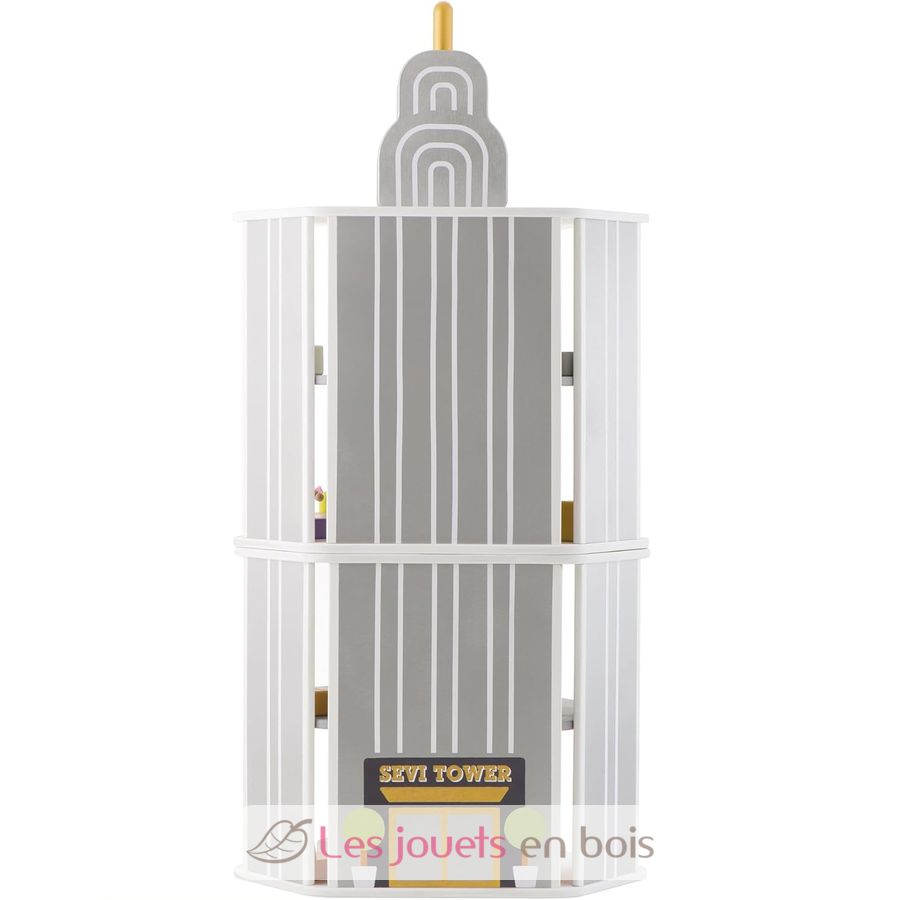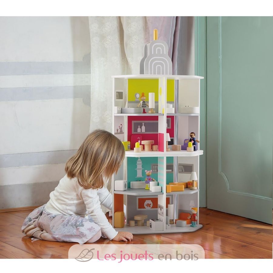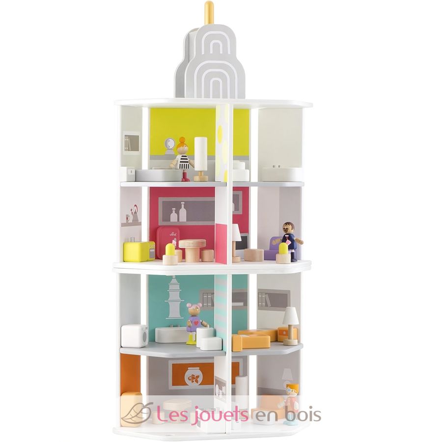 Dieser außergewöhnliche Wolkenkratzer mit seinen vielen Designelementen und sorgfältigen Oberflächen ist ein wahrhaft originelles Puppenhaus aus Holz.