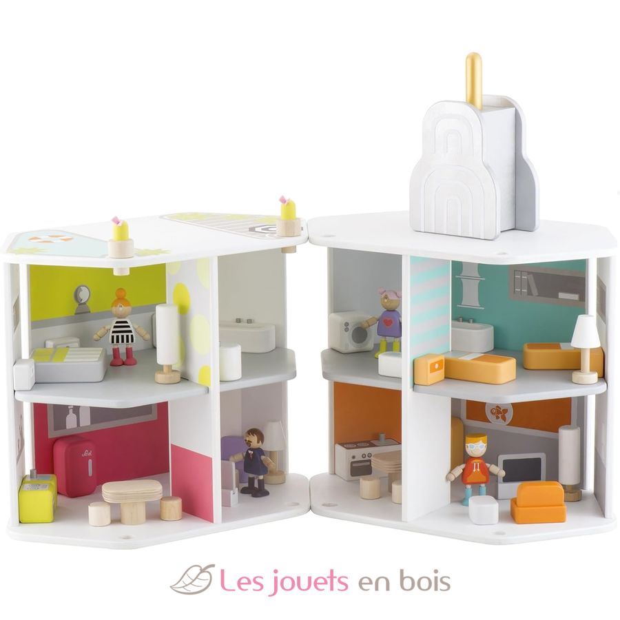 Dieses Puppenhaus besteht aus zwei stapelbaren oder nebeneinanderstellbaren Modulen für mehr Spielspaß. Es ist mit Möbeln und vier Figuren ausgestattet, um Ihrer Fantasie freien Lauf zu lassen.