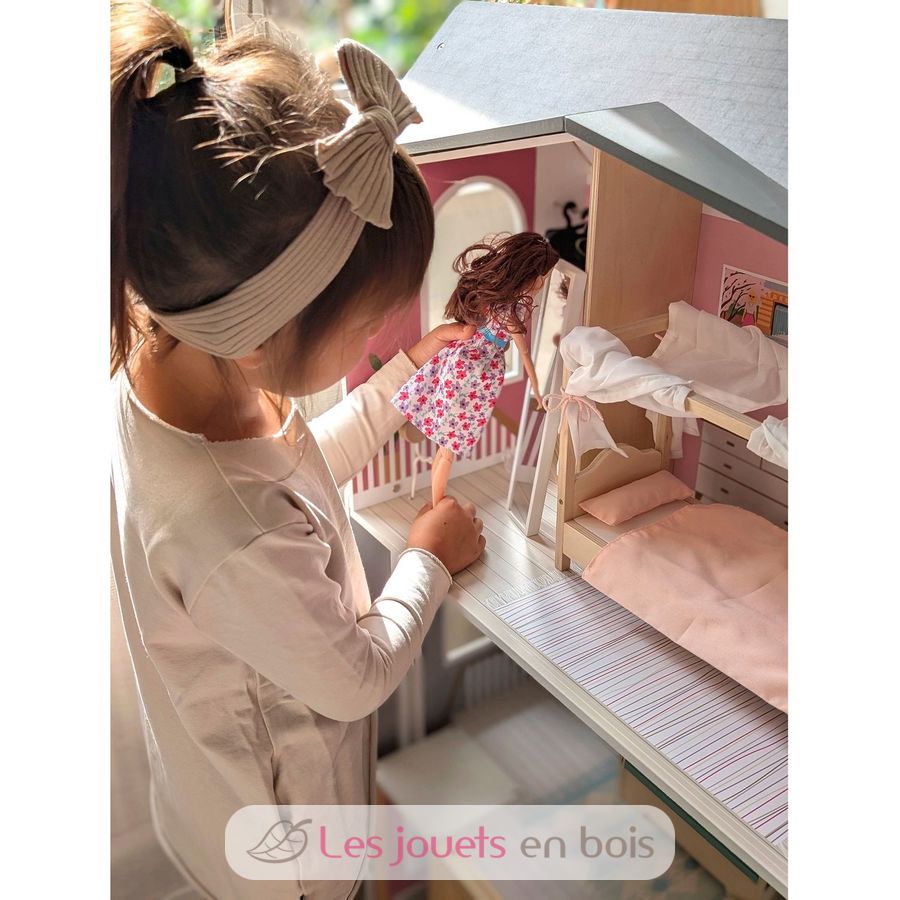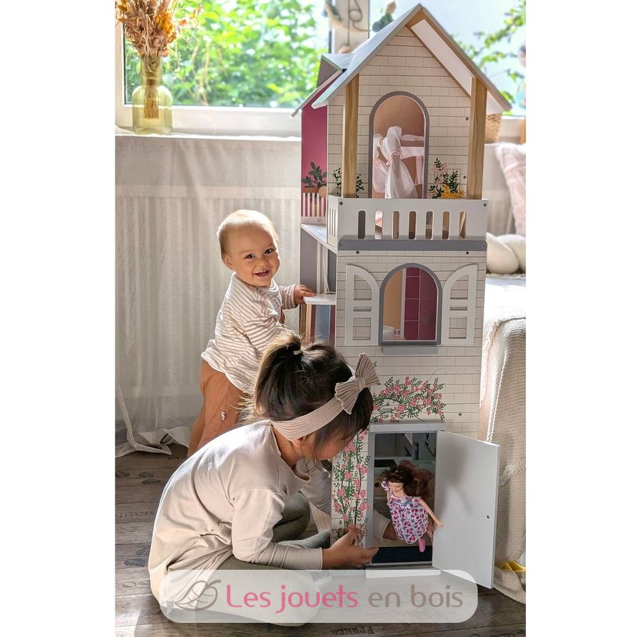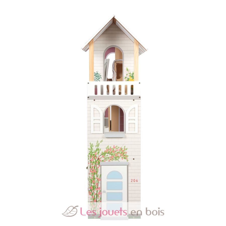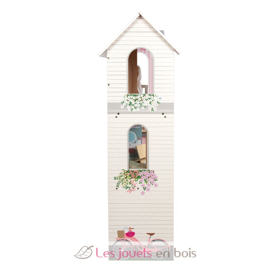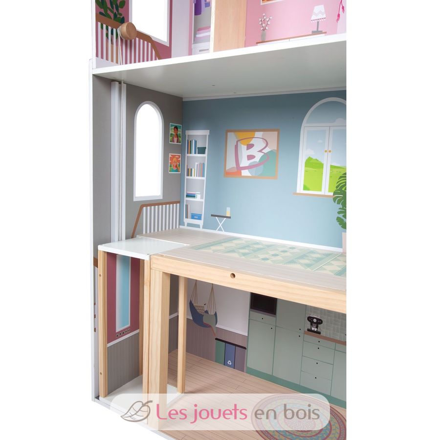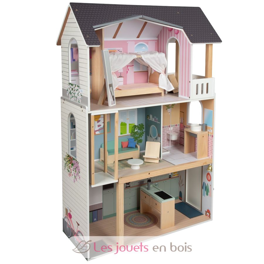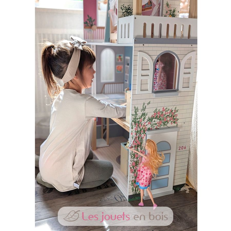 Mit drei geräumigen Etagen und offener Front schafft sie eine realistische Wohnwelt, in der Kinder ihre Fantasie ausleben können. Das gradlinige Haus begeistert mit einer hellen Außenfassade, dezenter Farbgestaltung, sichtbarem Vollholzanteil und vielen detailreichen Wandillustrationen, die jedem Raum lebendig wirken lassen.