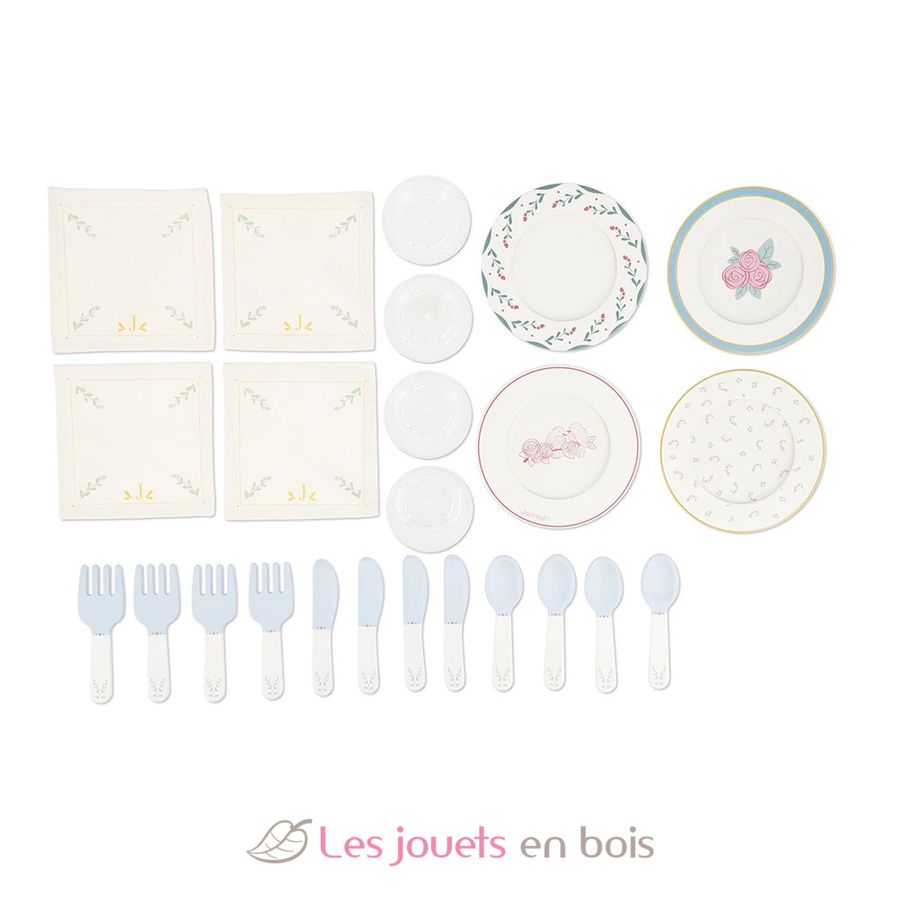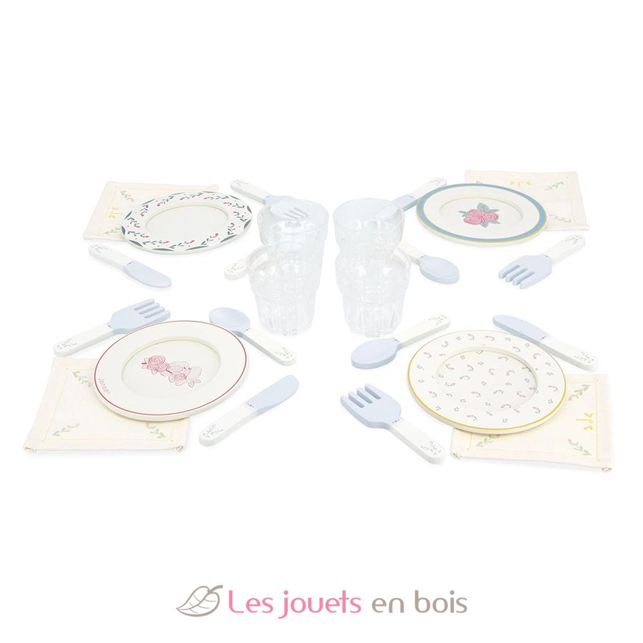 So finden Sie in diesem Nachahmungsset: 4 Holzteller mit Blumendekor, 4 Stoffservietten, 4 Bestecksets (Löffel, Gabeln und Messer) und 4 Plastikgläser im Retro-Look. Wenn das Picknick vorbei ist, verstaut man alle Accessoires in dem hübsch verzierten Koffer.