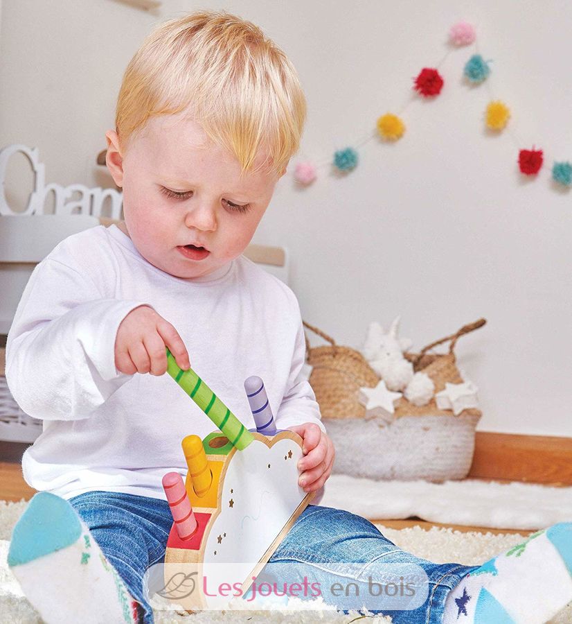 Eine hölzerne Wolke mit 5 farbigen Stöcken in den Farben des Regenbogens. Das Kind kann zuerst Spaß haben, die Stöcke in die Wolke einzufügen, indem es die Farben zusammenbringt, und dann zum nächsten Level übergehen: drücken, loslassen und fangen!