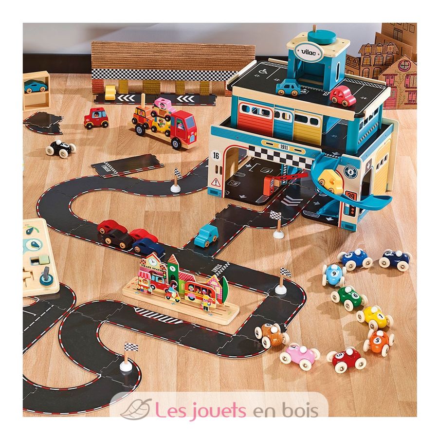 Entdecken Sie die Vilacity Rennbahn, eine 42-teilige Pappbahn mit 2 Holzautos.