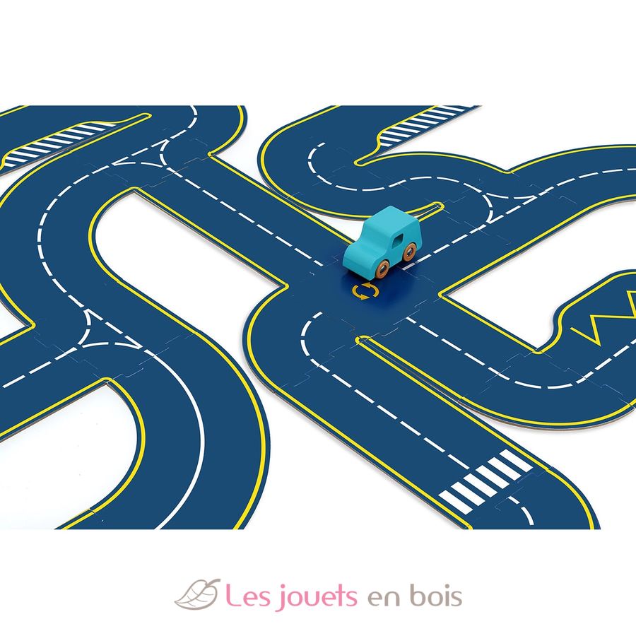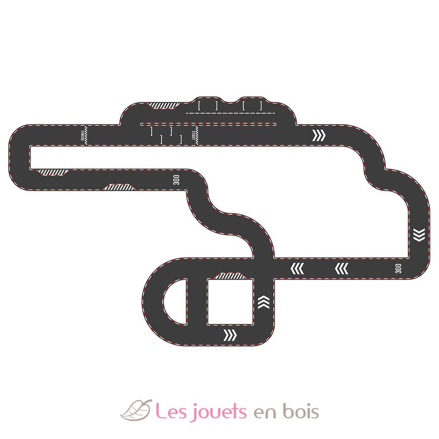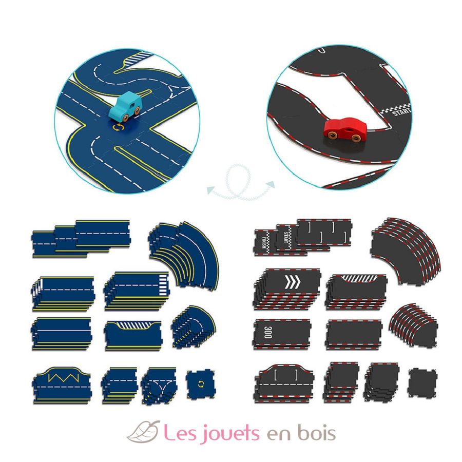 Diese einfach aufzubauende Bahn besteht aus 48 Pappteilen und 2 Holzautos. Die Teile sind beidseitig bedruckt: eine Rennstrecke, die andere eine Straßenstrecke, was vielfältige Konstruktionsvarianten ermöglicht.