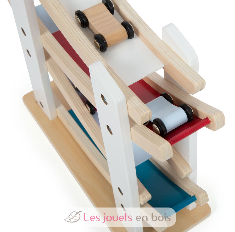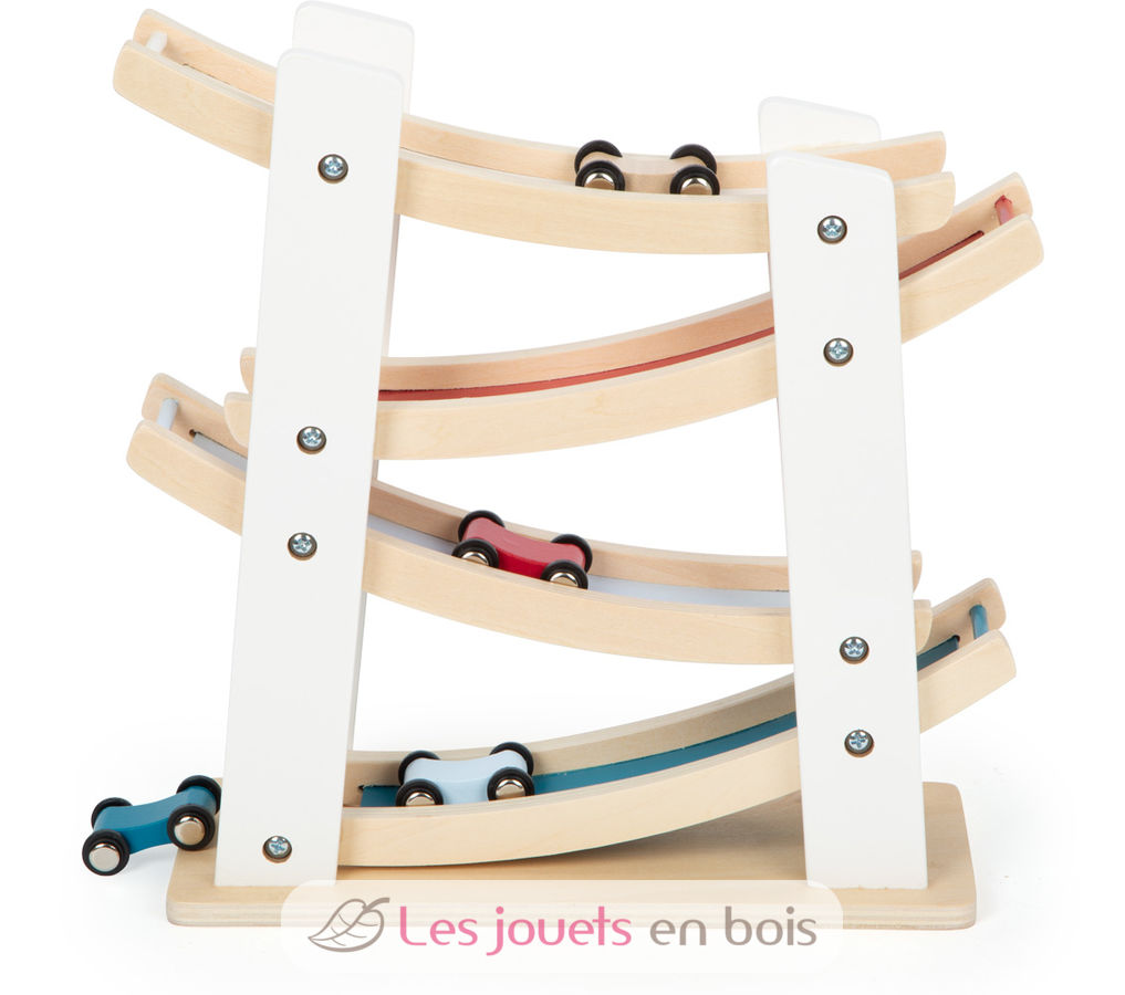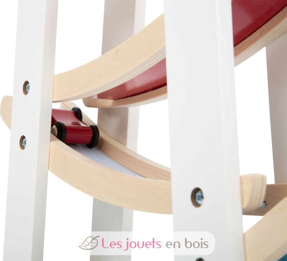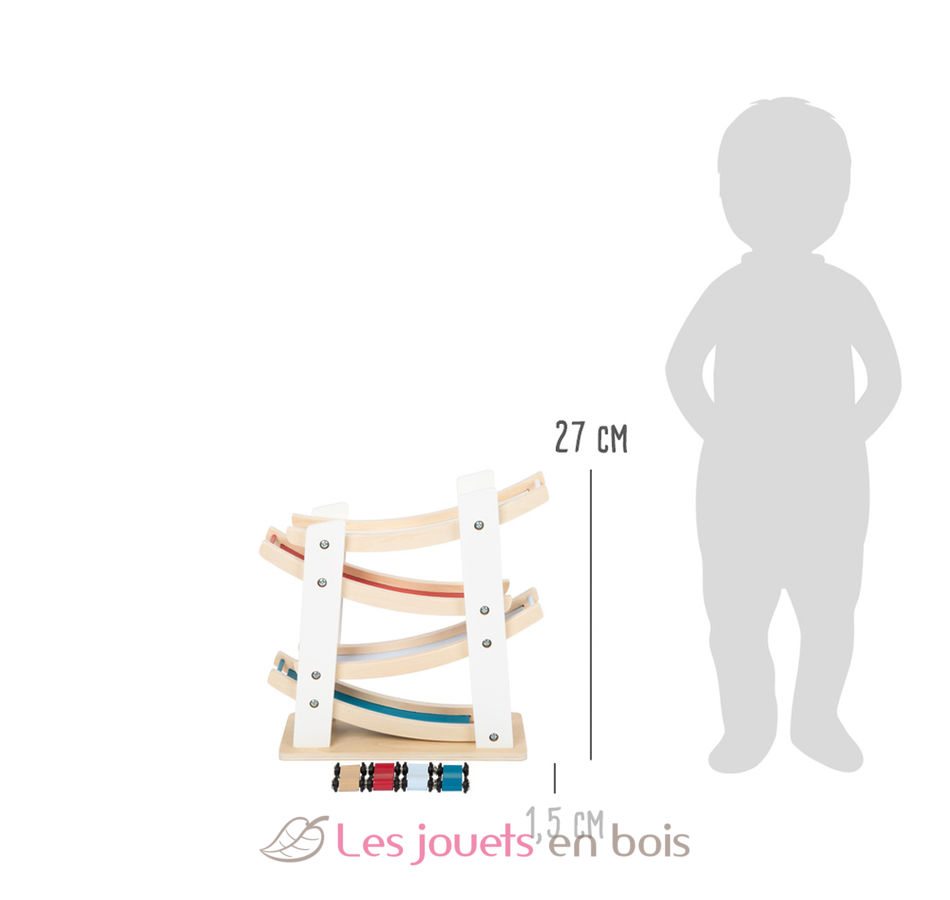 Auf die Plätze, fertig, Abfahrt! Diese Klick-Klack-Rennbahn aus Holz mit stabilem Standfuß verspricht rasante Action, wenn die vier kleinen Holzautos die Rampen hinuntersausen. Auf ihrer Fahrt von Etage zu Etage schlagen sie lustige Purzelbäume und sorgen für großen Spaß. Weiß lackiertes und naturbelassenes Holz in Kombination mit der klassischen Farbgestaltung der Rampen macht die Bahn zu einem Hingucker, der sich dezent in jedes Kinderzimmer einfügt.