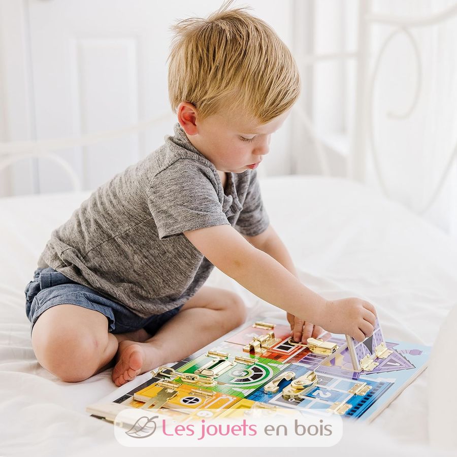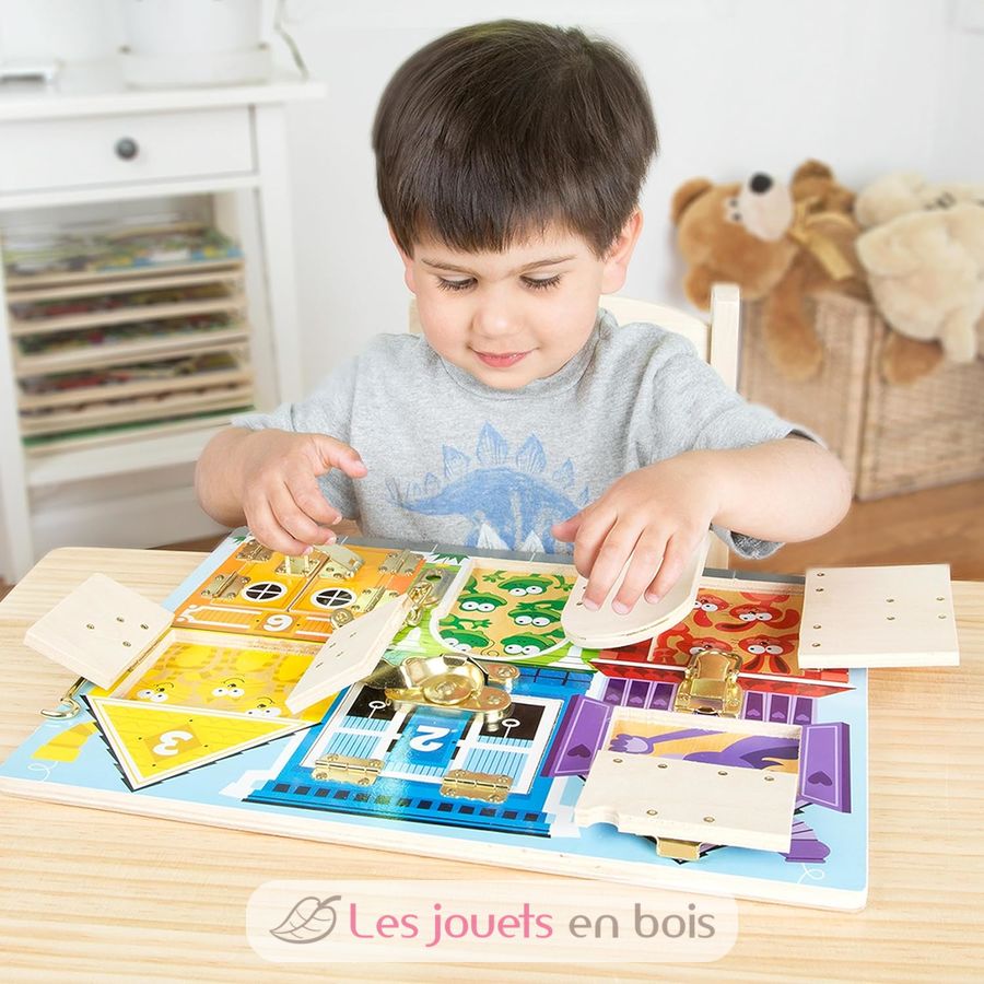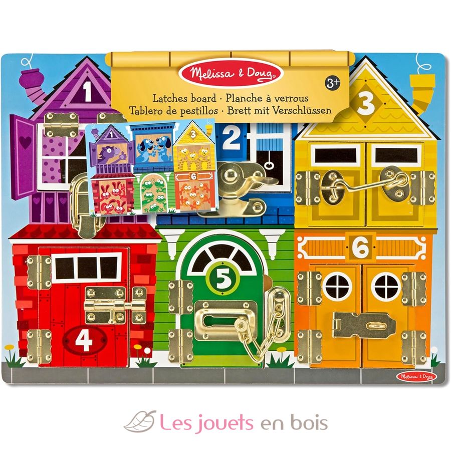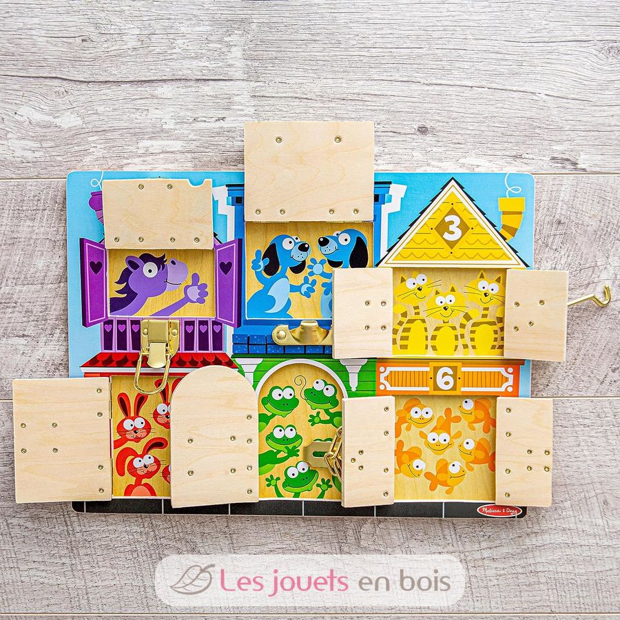 Rückgängig ein Schloss oder Riegel , klappen Sie die nummerierte Tür und zählen auf der Suche nach Spaß , wenn das Bild unter ist auf diesem Holzspielbrettund pädagogisches Spielzeug enthüllt! Bauen Feinmotorik beim Lernen Farben, Zahlen, Tiere und vieles mehr! Top-Pick für Special Needs Erweiterungsmöglichkeiten : Viele Wege führen zum Spielen und lernen : • Suchen eines bestimmten farbigen Tür und identifizieren die Tiere hinter sich. " Zeigen Sie auf die rote Tür . Welche Tiere sind dahinter? " ( Kaninchen) • Finden Sie ein Haus und identifizieren eine spezifische Form und / oder Nummer : " Welches Haus hat einen Kreis mit der Zahl 5" (grün) • Zählen Sie die Tiere hinter einer Tür oder Fenster. " Öffnen Sie die Verriegelung an der blauen Haus. Wie viele Hunde sehen Sie? " (2) • Identifizieren ein Haus etwas beschreiben, auf sie. " Welche Farbe hat das Haus mit zwei kreisförmigen Fenster " ? (orange) • Suchen Sie ein bestimmtes Tier , nennen seine Farbe und zählen. " Finden Sie die Frösche. Welche Farbe haben die Frösche ? Wie viele Frösche sehen Sie? " (grün, 5) • Suchen Sie eine bestimmte Form auf ein Haus und fragen, wer innen lebt . " Zeigen Sie auf den lila Winkel . Wer wohnt in diesem Haus?" (1 Pony ) Abmessungen: 15,5 "x 11,5 " x 1,25 " Educational Holzspielzeug von der weltbekannten amerikanischen Marke Melissa & Doug. Ref: 13784