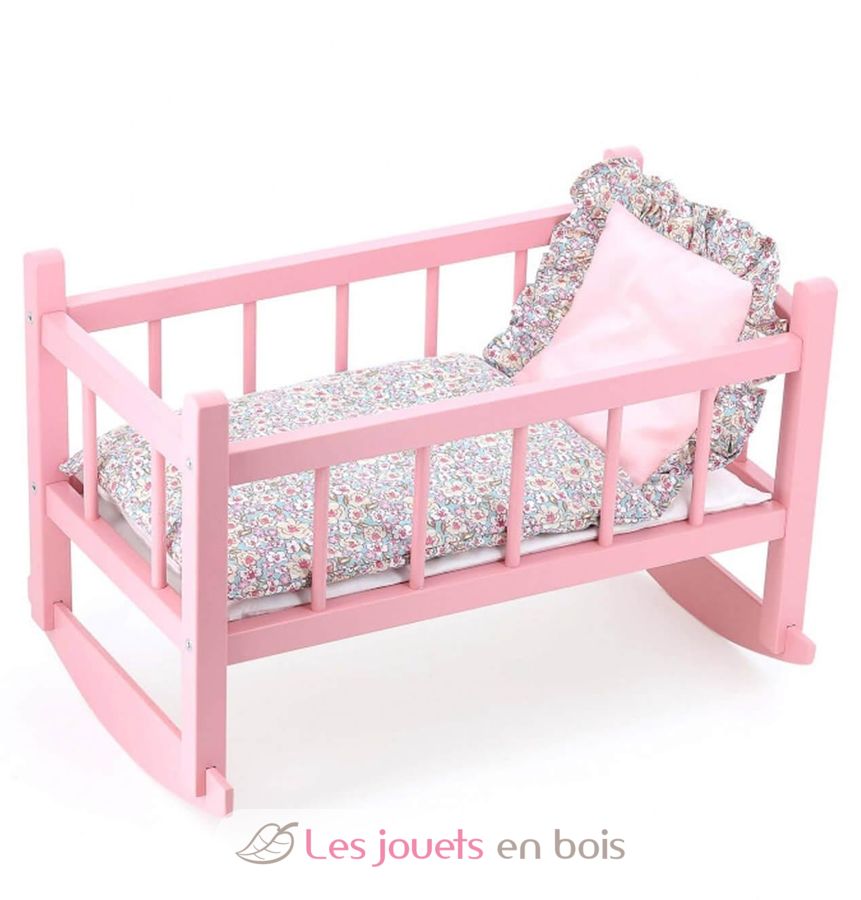 Schaukelbett aus massiven Holz für Puppen. Ein schönes Bett hergestellt in Europa für Puppen : Grösse 40 cm. Die Bettwäsche ist aus geblümtem Baumwollstoff. Holzwiege von der Handelsmarke Petitcollin. Geeignet ab 3 Jahre - das Bett muss von einem Erwachsenen zusammengesetzt werden.