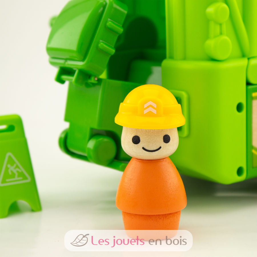 Dieser LKW wird mit einer grünen Tonne, einem Besen, einem Verkehrskegel und zwei Figuren geliefert, für noch mehr Erzählspaß.