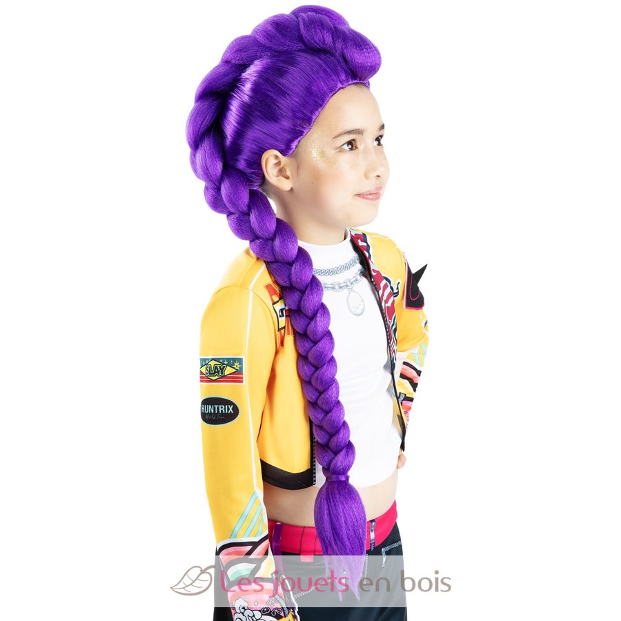 Die Rumi-Perücke hat langes, lila Haar mit einem extra langen Zopf.
