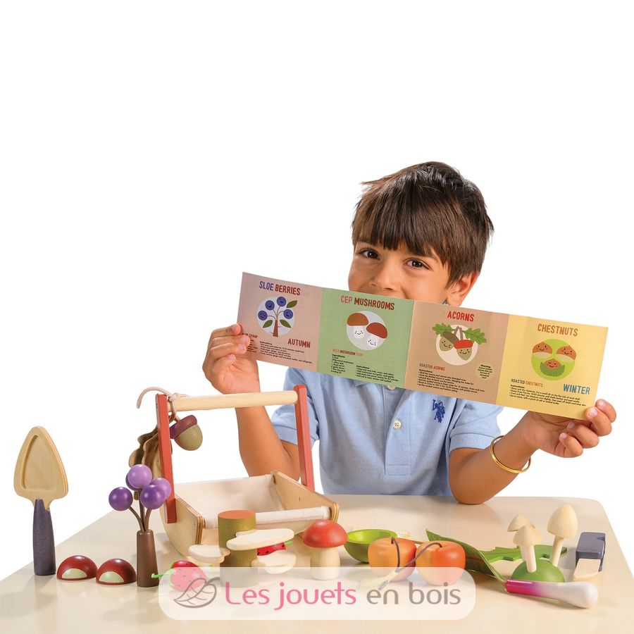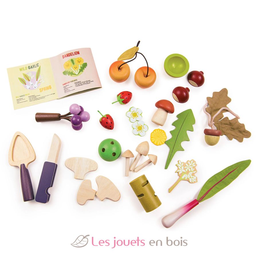 Dieses Rollenspielset enthält ein faltbares Holzmesser und eine Pilzkelle zum Pilzesammeln. Ihr Kind entdeckt beliebte und essbare Schätze, die das ganze Jahr über im Wald oder an Hecken gesammelt werden können: 2 Wildäpfel, 2 Walderdbeeren, Bärlauch, Blumen, 3 kleine Pilze, einen Steinpilz, Schlehen, ein Löwenzahnblatt und eine Löwenzahnblüte, Pilze am Stamm und eine Kastanie.