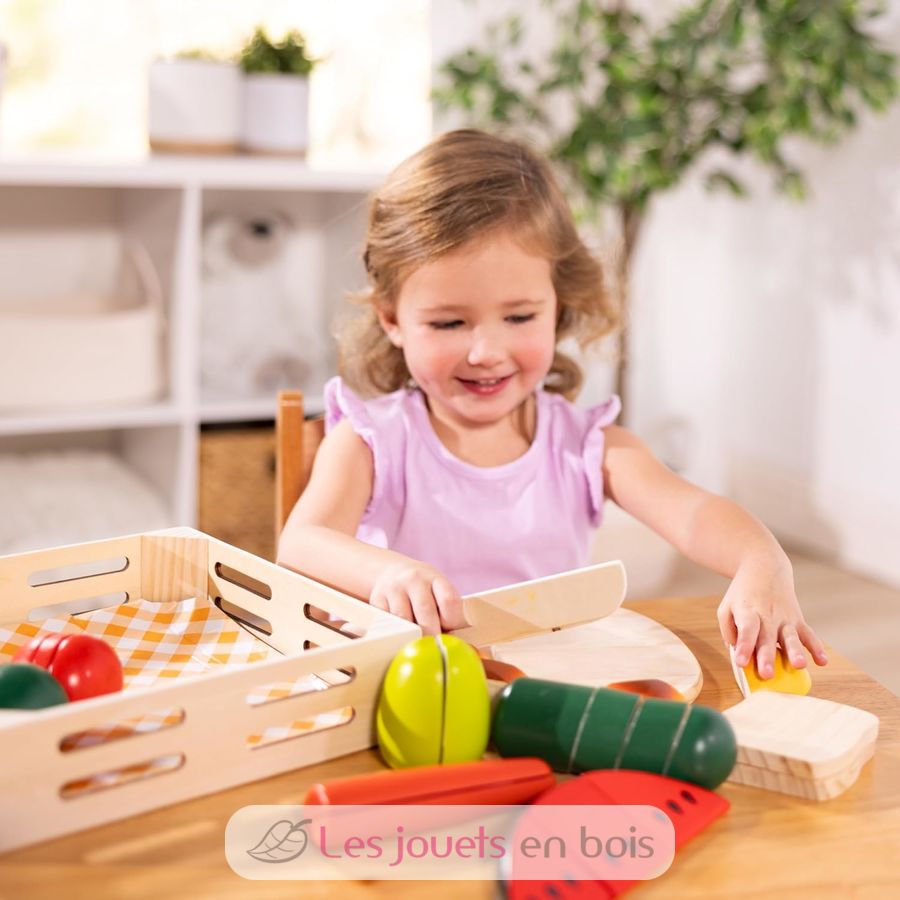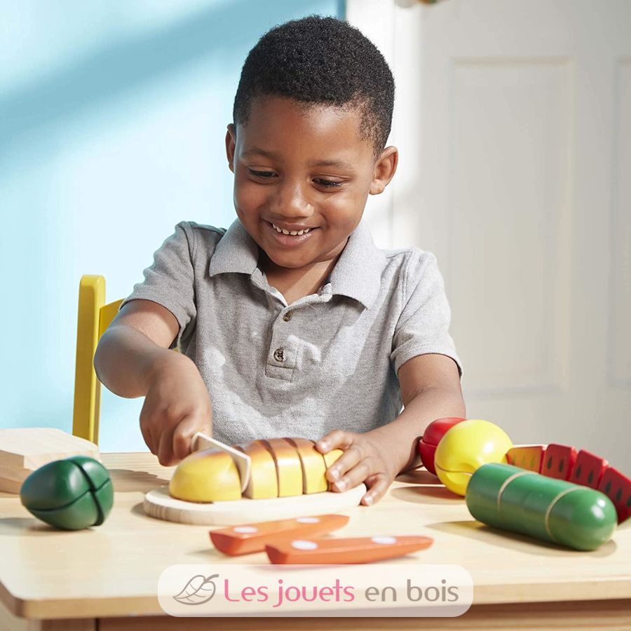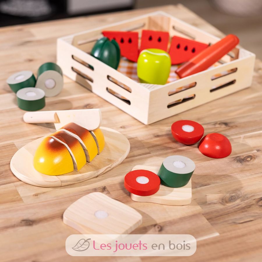 Schneiden Essen wie ein echter Koch. Diese kleine Box aus Holz Essen mit Holz Essen, ein Schneidebrett und Messer. Dieser Satz von Holz hacken Lebensmittel, die Marke Melissa & Doug, ist ideal für Kinder zu Fraktionen einzuführen.