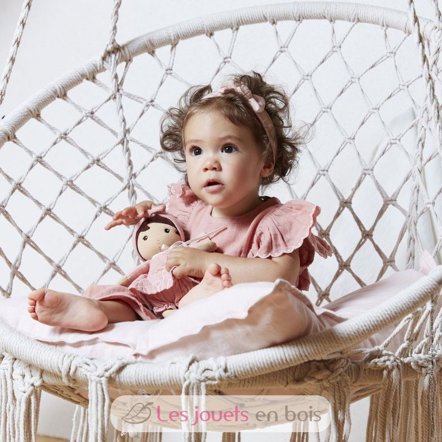 Die sanften Farbtöne von Amandine sind eine Ode an die natürliche Schönheit und die Zurückbesinnung auf das Wesentliche. Ihre dunkle Haut ist die eines Kindes, das im Freien aufgewachsen ist. Das schlichte, weite Kleid ist vor allem bequem und erinnert an das Slow Life. Gleichzeitig ist es sehr weich und wird kleine Hände zum Streicheln verführen.
