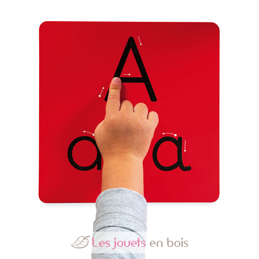 Dieses schöne Lernspiel aus Holz ist ideal, um die Buchstaben des Alphabets zu entdecken und nach und nach zu lernen, sie zu schreiben. Jede Karte entspricht einem Buchstaben. Auf der Vorderseite steht ein erhabener Buchstabe in drei Formen (Großbuchstaben, Kleinbuchstaben und Schreibschrift) mit Anzeige der Schreibrichtung, damit das Kind den Buchstaben korrekt formen kann. Das Kind kann mit den Fingern über die erhabenen Buchstaben fahren, um die Formen und die Schreibrichtung zu verinnerlichen. Auf der Rückseite befindet sich eine abwischbare Seite, um zu üben, den Buchstaben nach Vorlage zu schreiben.