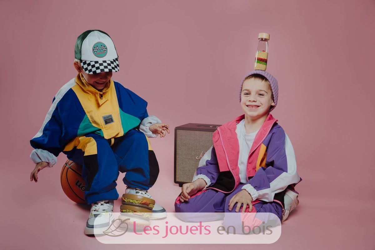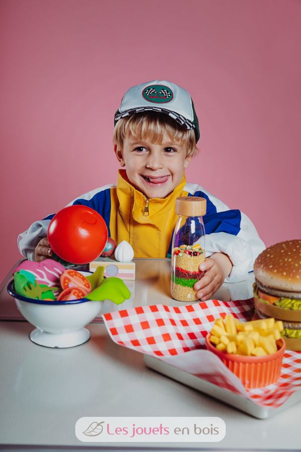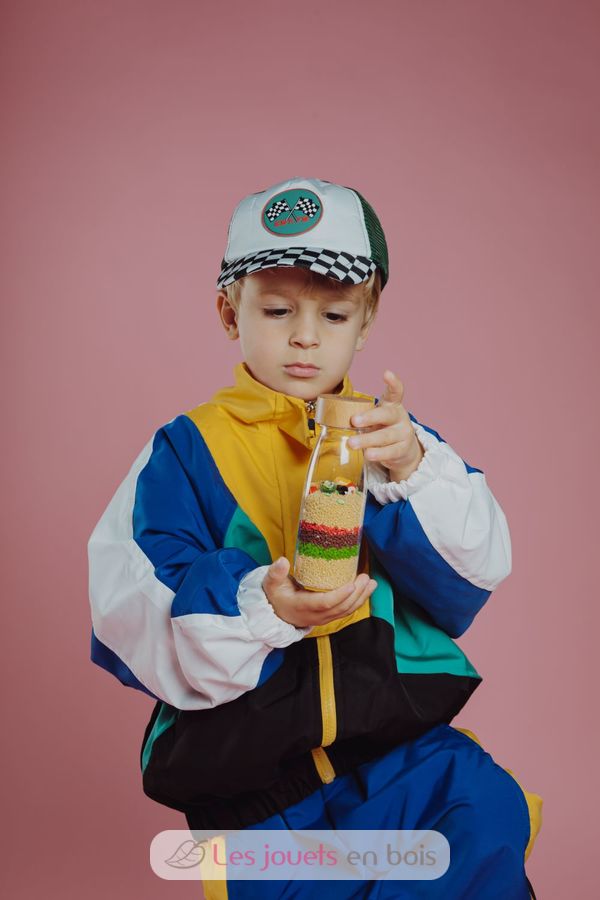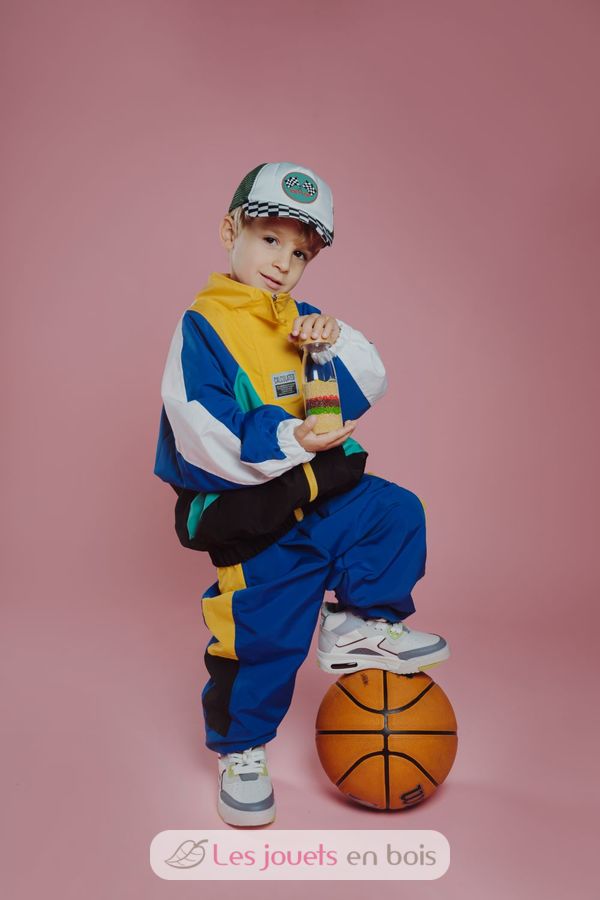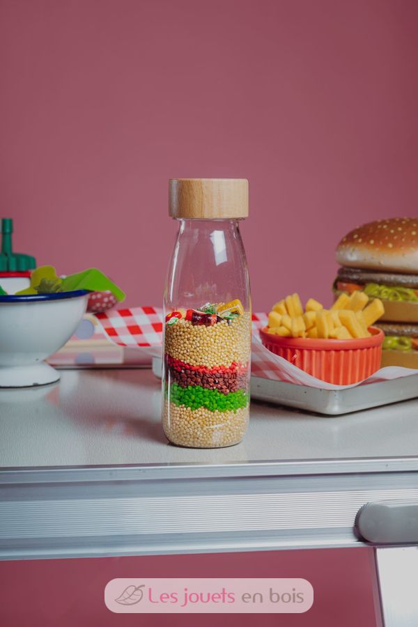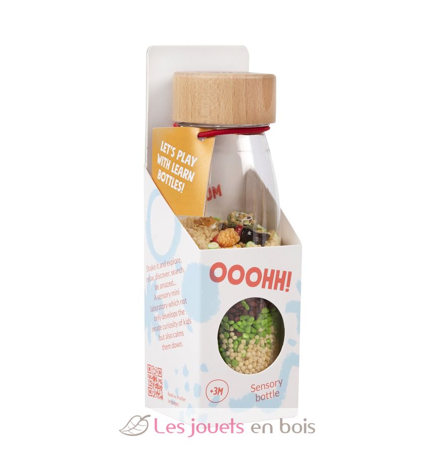 Die in Spanien handgefertigte Petit Boum-Sensorflasche aus recycelbarem Kunststoff, einem Ahornholzstopfen und natürlichen Elementen wie gehacktem Reis, farbigen Fadennudeln oder sogar Maiskörnern ist unzerbrechlich. Es ist für Kinder ab 3 Monaten gedacht und konzipiert. Der Innenraum ist wasserdicht und jede Flasche hat einen vollständig versiegelten Doppelstopfen, damit die Kleinen sicher damit umgehen können. Petit Boum Sensorflaschen sind frei von BPA, Metall und Phthalaten.