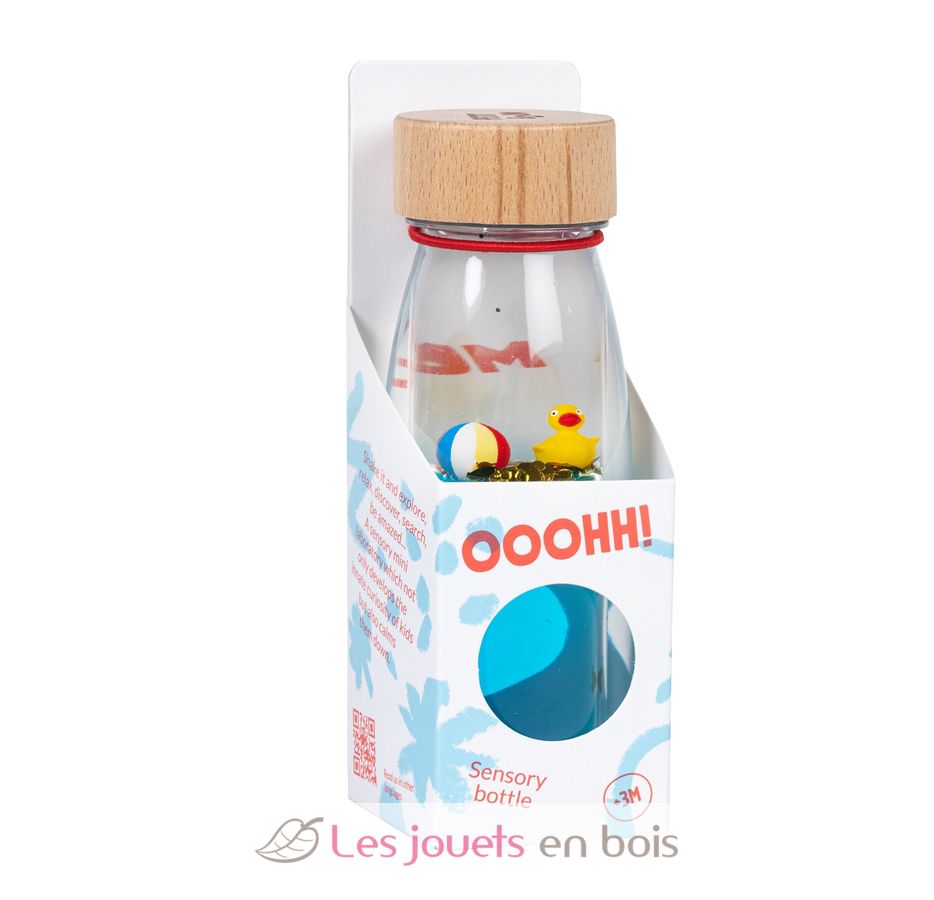 Entdecken Sie die Sensorische Flasche Move Ente der Marke Petit Boum. Ein farbenfrohes Lernspielzeug, inspiriert von der Montessori-Pädagogik, das die Sinne von Babys ab 3 Monaten anregt.