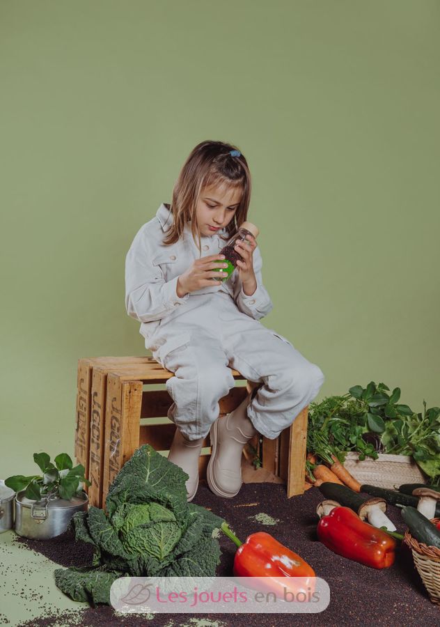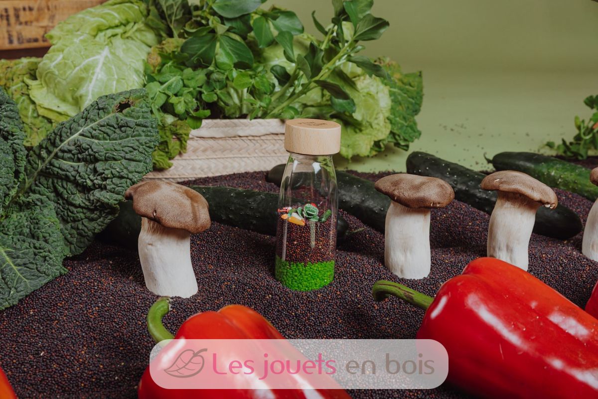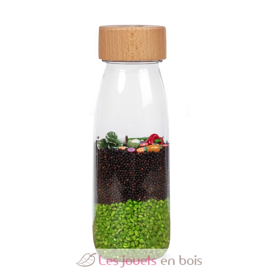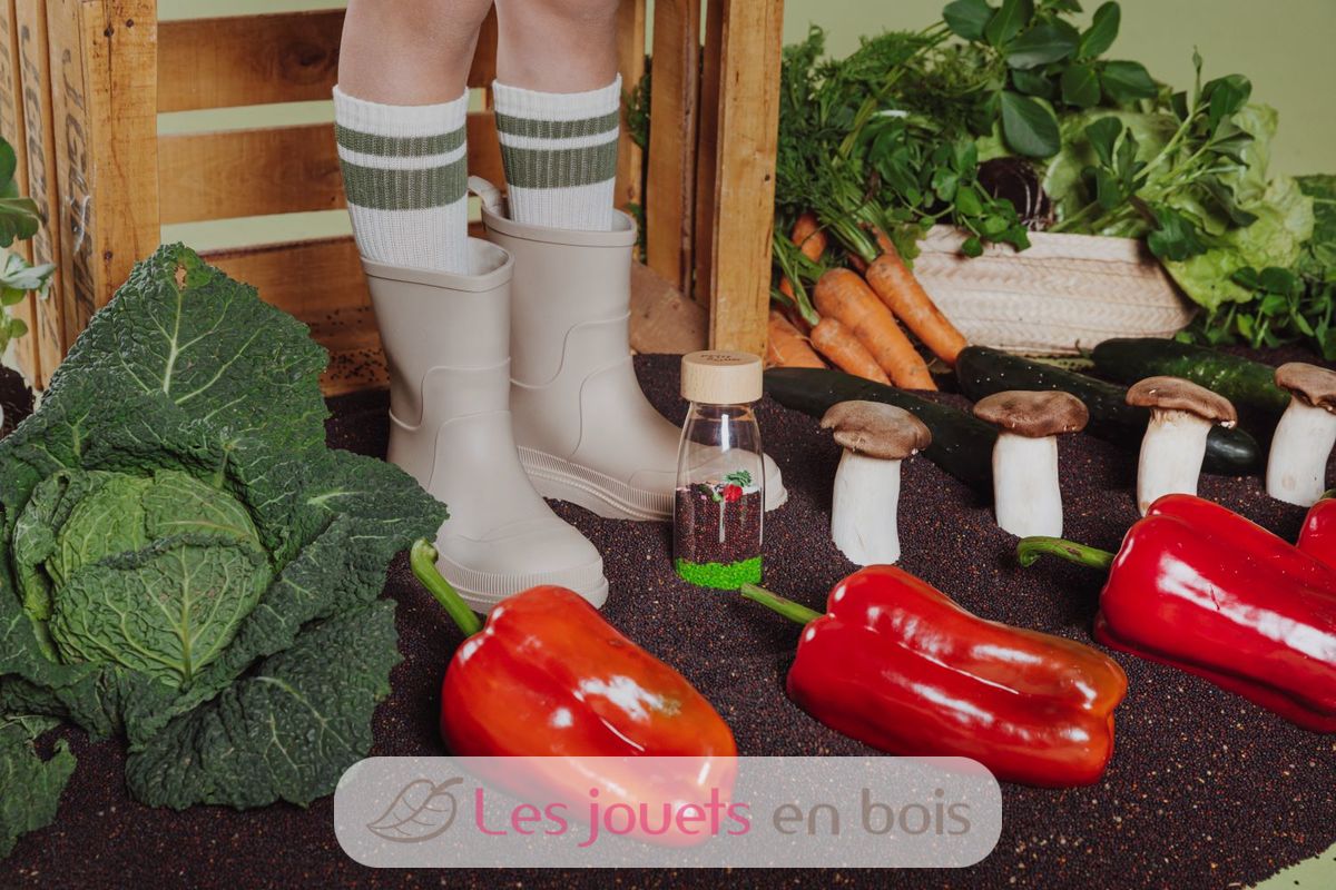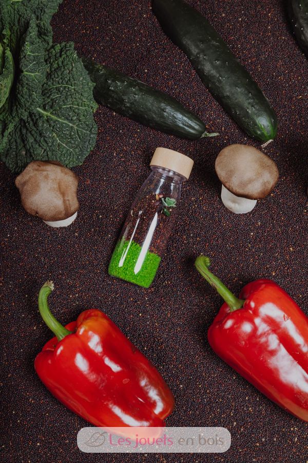 Entdecken Sie die Sensorische Flasche Veggies der Marke Petit Boum. Ein farbenfrohes Lernspielzeug, inspiriert von der Montessori-Pädagogik, das die Sinne von Babys ab 3 Monaten anregt.