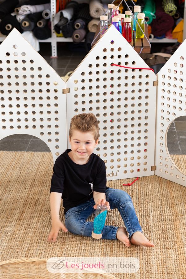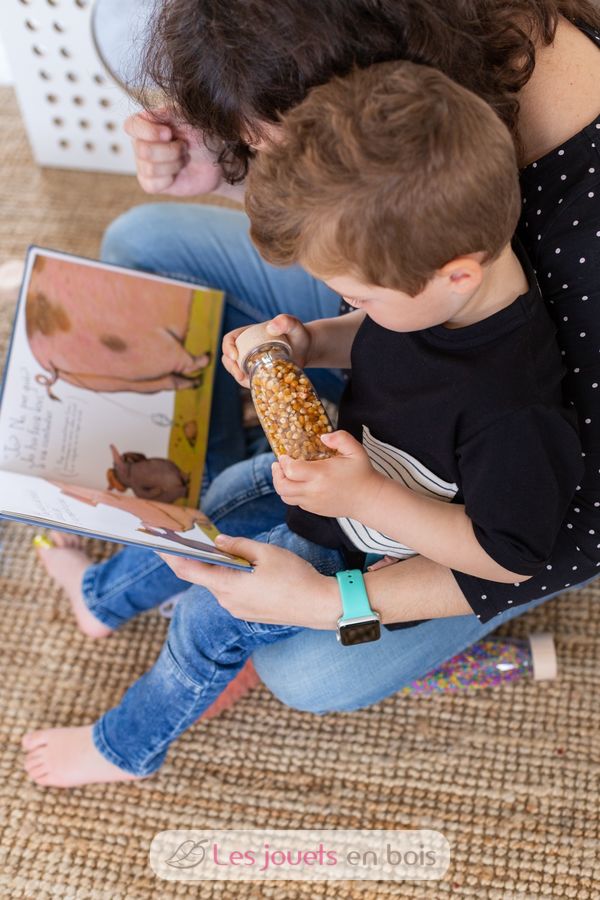 Die in Spanien handgefertigte Petit Boum-Sensorflasche aus recycelbarem Kunststoff, einem Ahornholzstopfen und natürlichen Elementen wie gehacktem Reis, farbigen Fadennudeln oder sogar Maiskörnern ist unzerbrechlich. Es ist für Kinder ab 3 Monaten gedacht und konzipiert. Der Innenraum ist wasserdicht und jede Flasche hat einen vollständig versiegelten Doppelstopfen, damit die Kleinen sicher damit umgehen können. Petit Boum Sensorflaschen sind frei von BPA, Metall und Phthalaten.