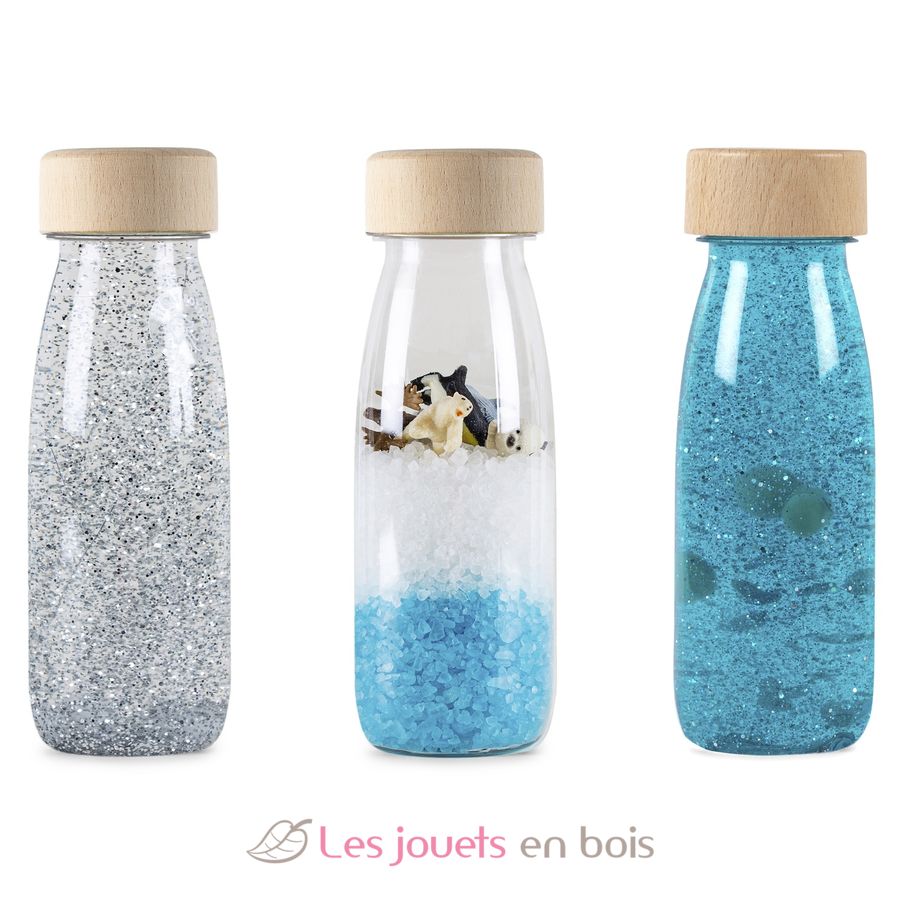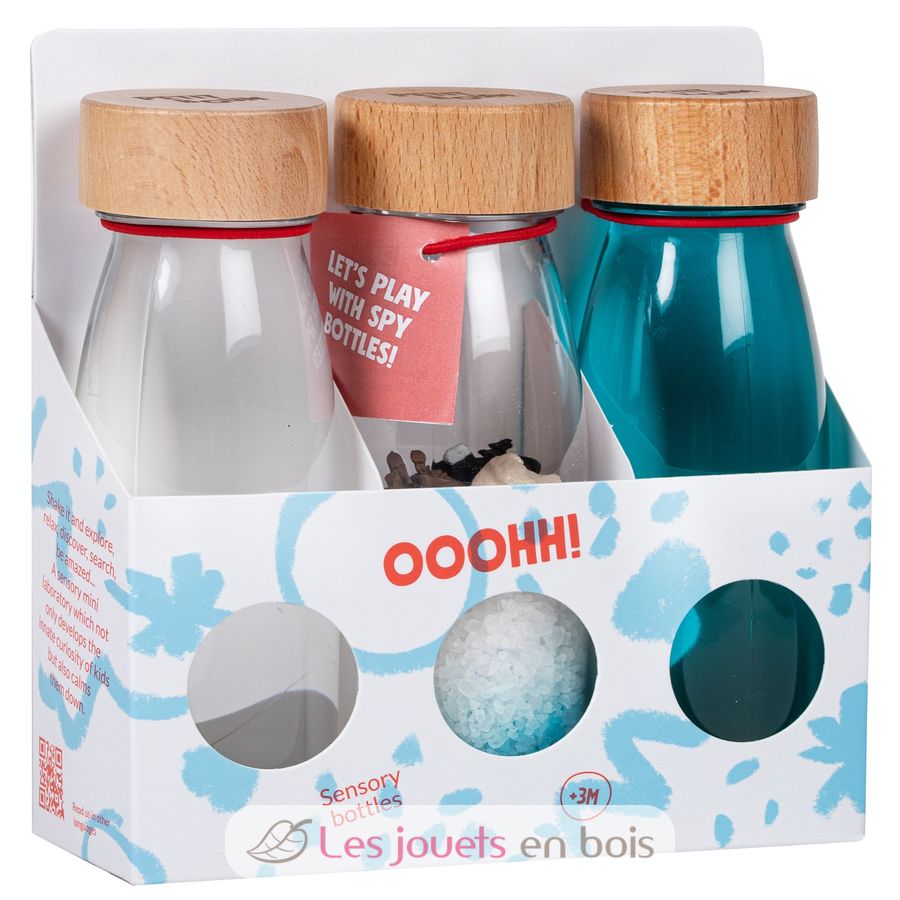 Entdecken Sie die Packung mit 3 Ice-Sensorflaschen der Marke Petit Boum: 1 grüne Float-Sensorflasche, 1 Türkis Float-Sensorflasche und 1 feste Spy-Arktis.
