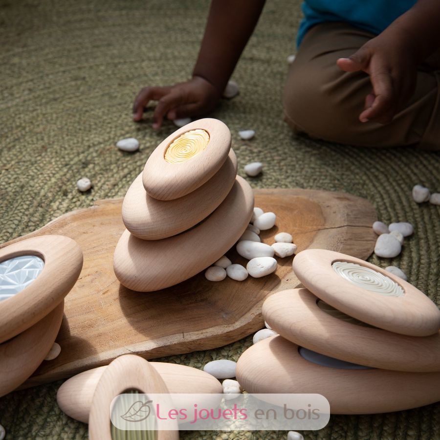 Kinder 2 und höher können sich mit dem 10-teiligen Sensorische Flusssteine-Set an sensorischen Spielen beteiligen, während sie das Stapeln und Balancieren üben.