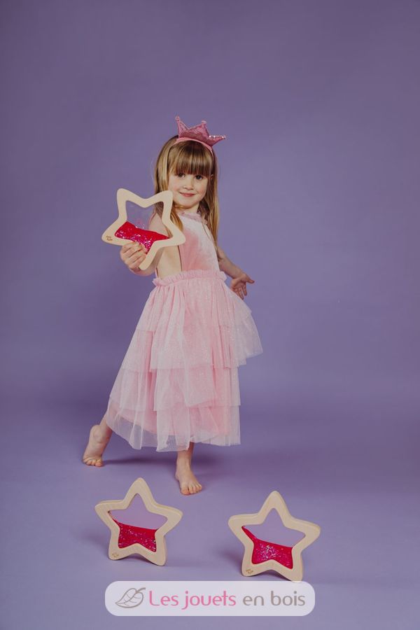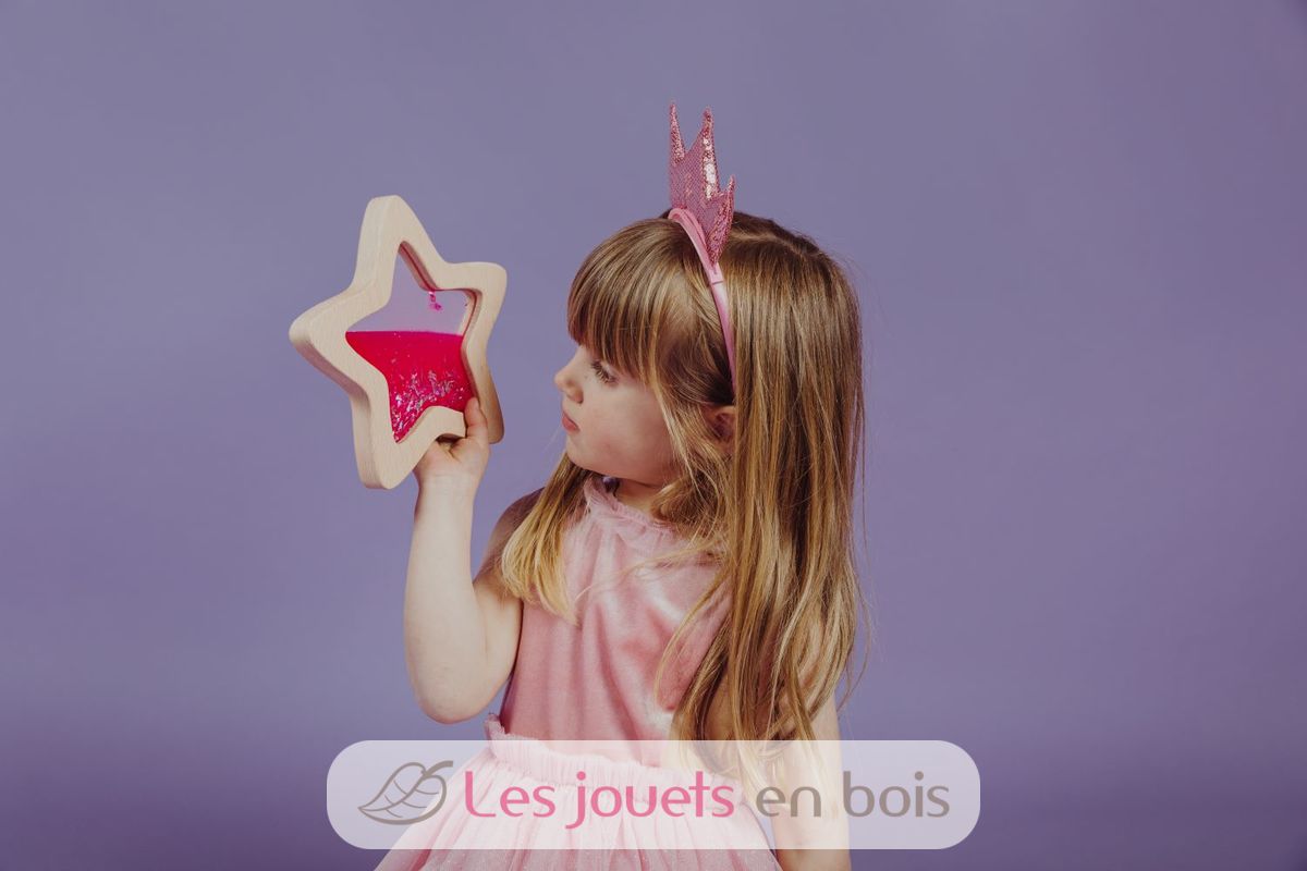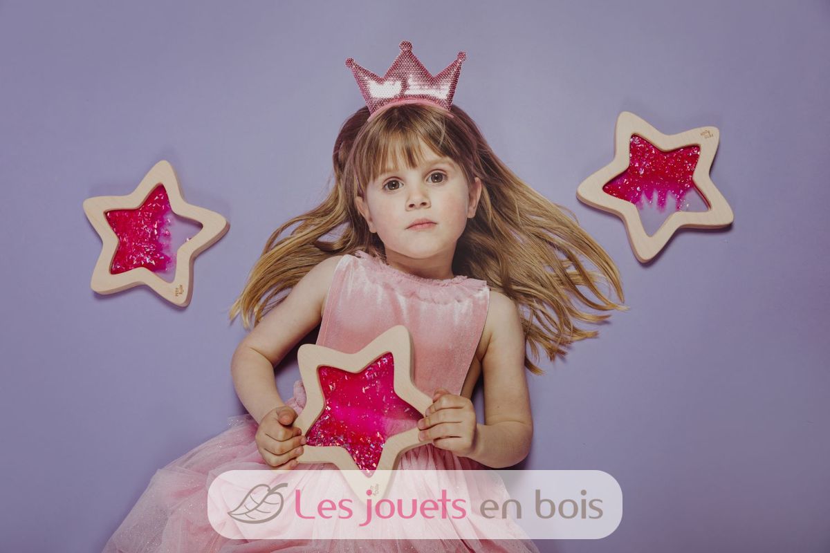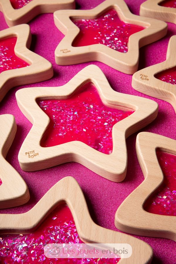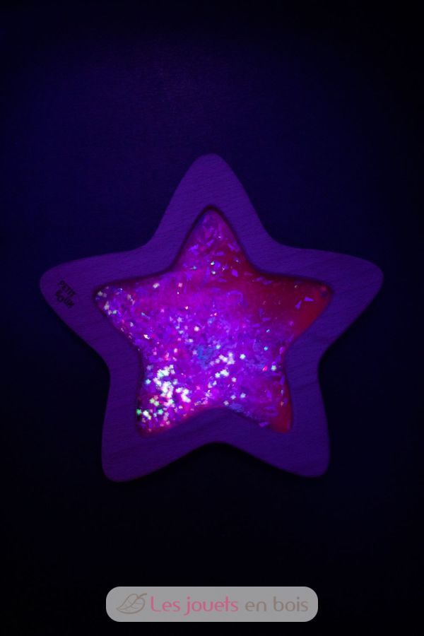 Ein kleines Stück Galaxie zum Greifen nah... Die ganze Magie der sensorischen Flaschen von Petit Boum jetzt in Sternform, mit einem Rahmen aus Buchenholz, der leicht von den Händen der Kleinen gegriffen werden kann. Dieser Stern ist mit farbiger Flüssigkeit, Glitzer und fluoreszierender Flüssigkeit gefüllt, die im Dunkeln leuchtet. Alles, was Sie brauchen, ist eine Bewegung, um Starbursts und die Effekte zu bestaunen, die Licht erzeugt, wenn es durch sie hindurchgeht. Eine Einladung zum Erkunden, um die Sinne und die Neugier der Kleinkinder zu wecken und in ein ruhiges und entspannendes Universum einzutreten.