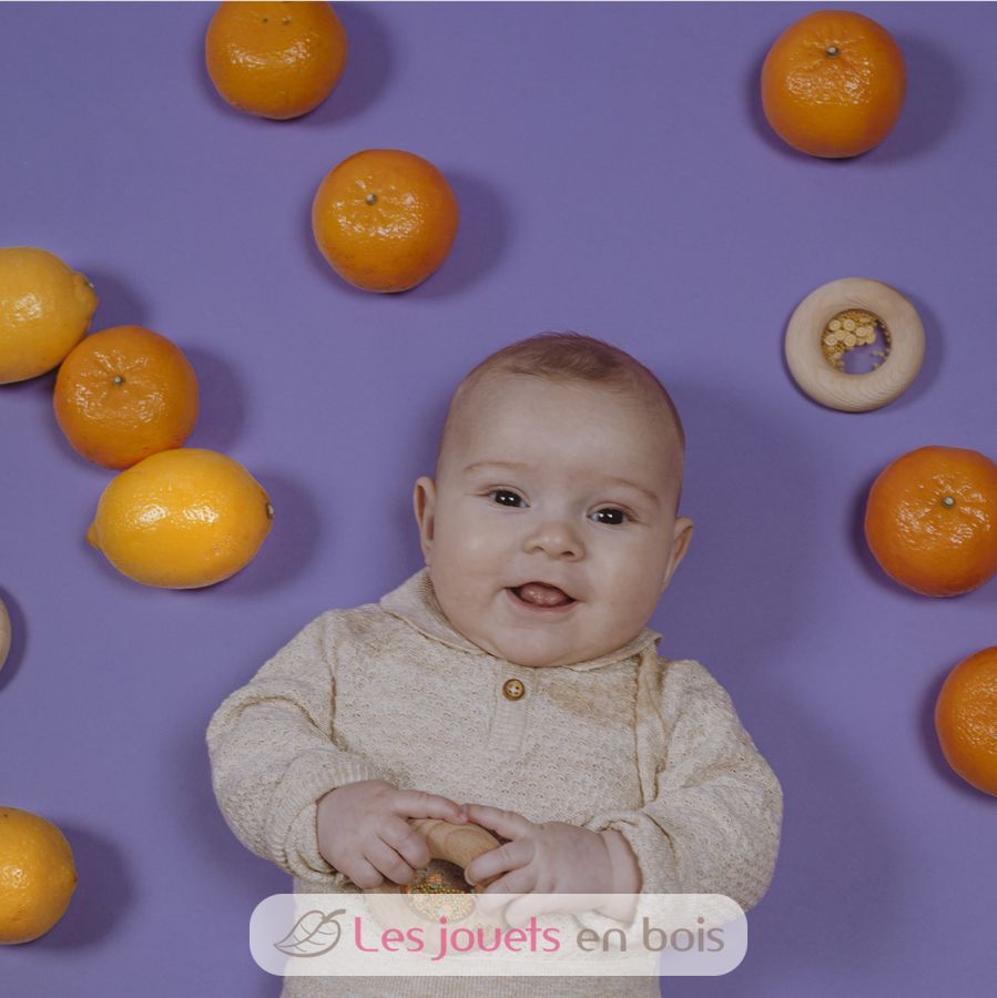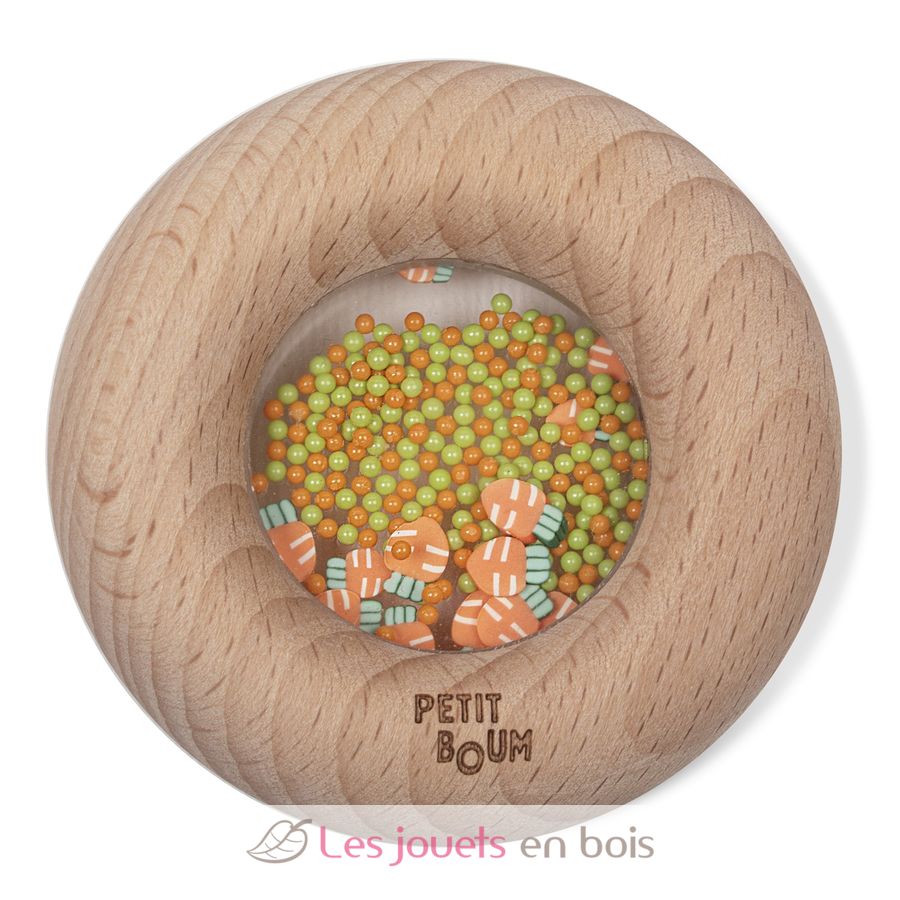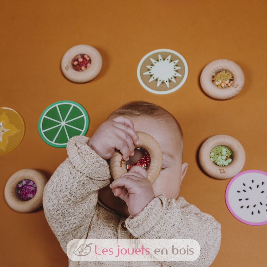 Dieses sensorische Spielzeug wird die Kleinen ab 6 Monaten begeistern. Diese glatte Holzrassel in Donutform ist perfekt für kleine Hände und lässt sich bequem greifen. Im Inneren kann das Kind leckere Obst- oder Gemüseformen erkennen, die beim Schütteln einen unwiderstehlichen sensorischen Klang freisetzen.