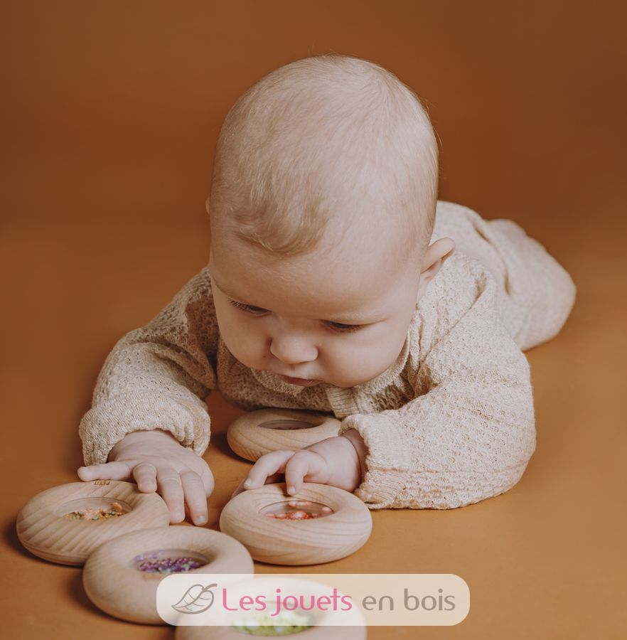 Entdecken Sie die sensorischen Donuts von Petit Boum: farbenfrohe und köstliche Rasseln mit einem lustigen und attraktiven Design.