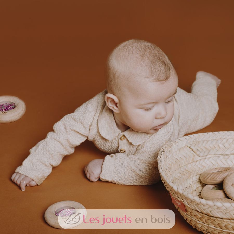 Dieses sensorische Spielzeug wird die Kleinen ab 6 Monaten begeistern. Diese glatte Holzrassel in Donutform ist perfekt für kleine Hände und lässt sich bequem greifen. Im Inneren kann das Kind leckere Obst- oder Gemüseformen erkennen, die beim Schütteln einen unwiderstehlichen sensorischen Klang freisetzen.