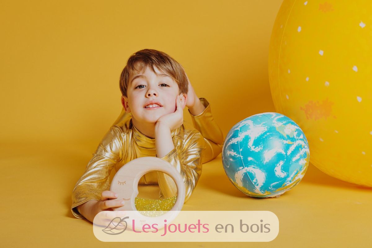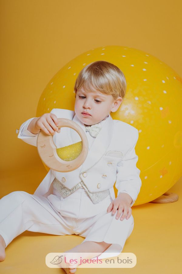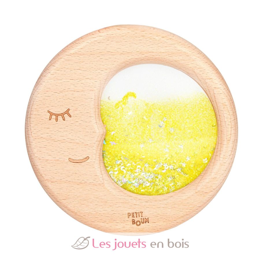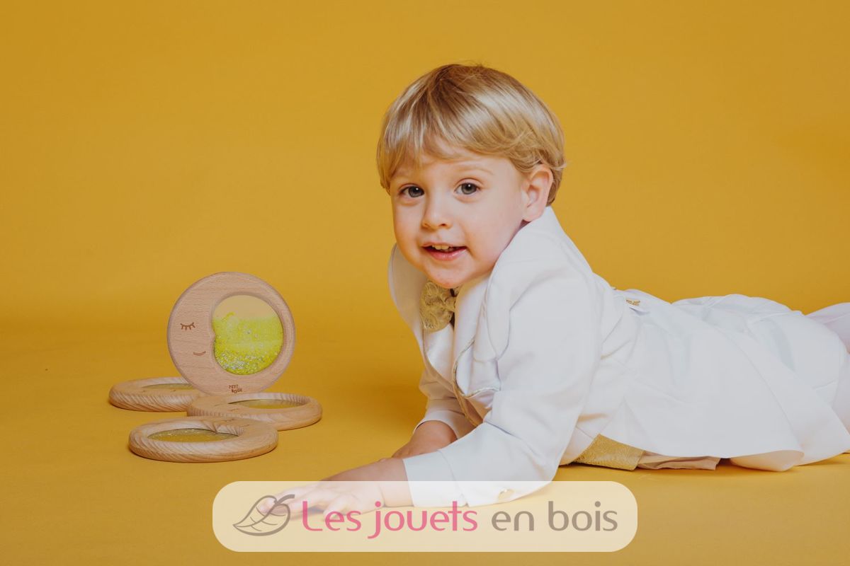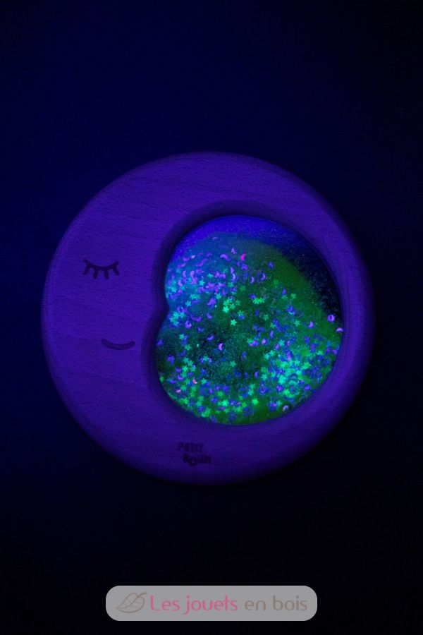 Ein kleines Stück Galaxie zum Greifen nah... Die ganze Magie der sensorischen Flaschen von Petit Boum jetzt in Mondform, mit einem Rahmen aus Buchenholz, der leicht von den Händen der Kleinen gegriffen werden kann. Dieser Mond ist mit farbiger Flüssigkeit, Glitzer und fluoreszierender Flüssigkeit gefüllt, die im Dunkeln leuchtet. Alles, was Sie brauchen, ist eine Bewegung, um Starbursts und die Effekte zu bestaunen, die Licht erzeugt, wenn es durch sie hindurchgeht. Eine Einladung zum Erkunden, um die Sinne und die Neugier der Kleinkinder zu wecken und in ein ruhiges und entspannendes Universum einzutreten.