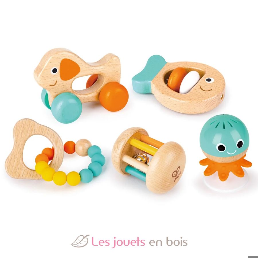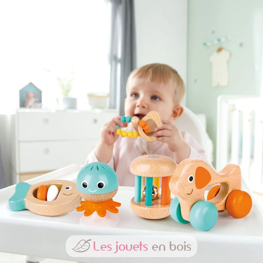 Dieses Set besteht aus einem Beißring, einer Fischrassel und einer Rassel mit Glöckchen, die schon in jungen Jahren verwendet werden können, einer Rassel mit Saugnapf, mit der das Baby spielen kann, sobald es am Tisch sitzt, aber auch einer kleinen Rassel Hund rollt, sobald das Baby zu krabbeln beginnt.