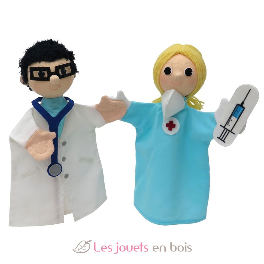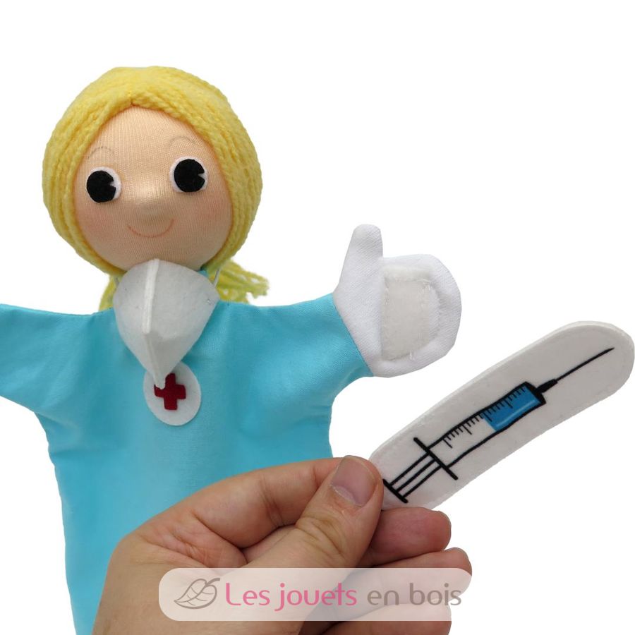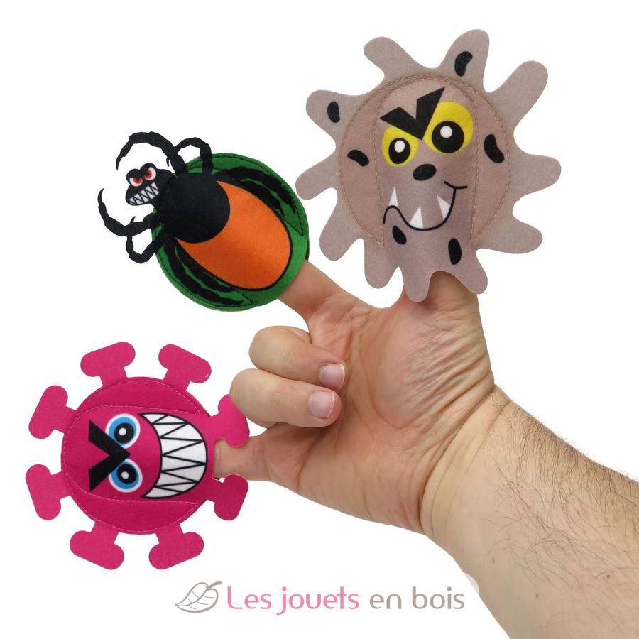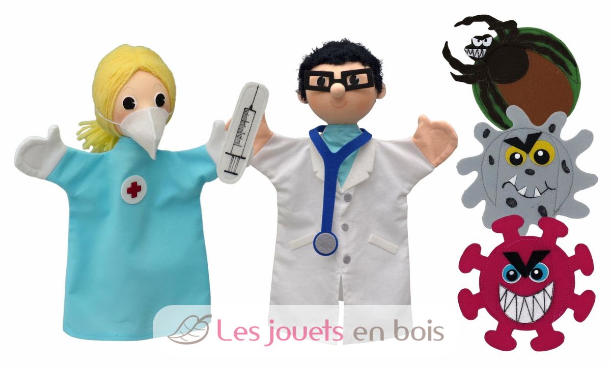Set mit 5 Puppen. Arzt und Krankenschwester sind Handpuppen. Coronavirus, Hepatitis und Zecken sind Fingerpuppen. Die Krankenschwester trägt eine abnehmbare Gesichtsmaske und eine mit Klettverschluss befestigte Spritze.