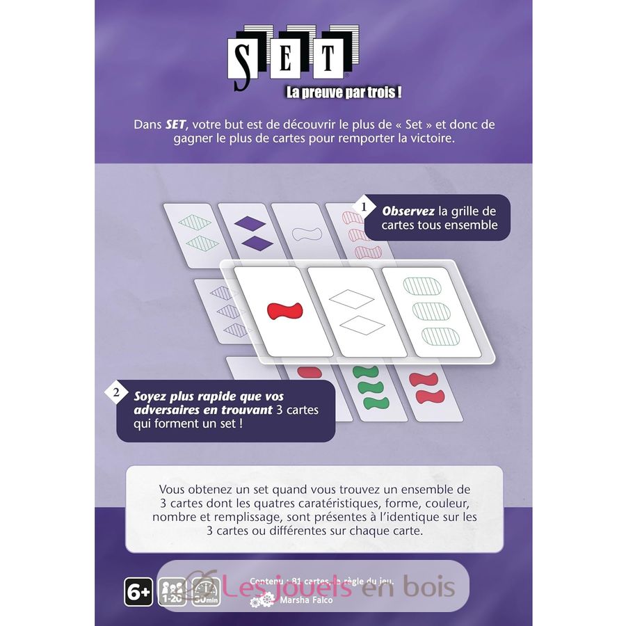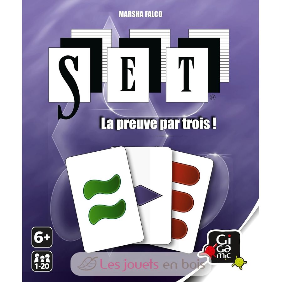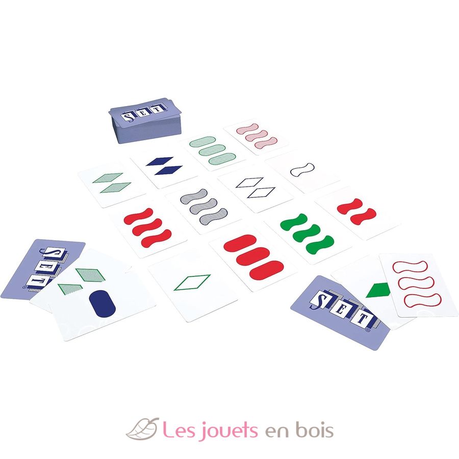 Ein „SET“ ist ein Satz von drei Karten, wobei jede der vier Eigenschaften entweder völlig identisch oder völlig unterschiedlich zu den anderen Karten ist. Der Spieler muss diese Kombinationen daher auf einen Blick erkennen, was die Dynamik und Herausforderung des Spiels erhöht.