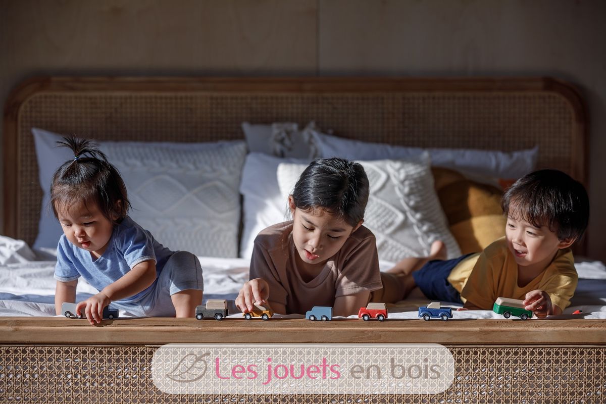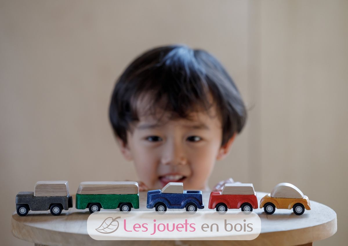 Entdecken Sie dieses Set aus 5 Fahrzeugen, die aus einer einzigartigen Kombination aus Massivholz und PlanWood entworfen wurden, einem innovativen Material aus Gummibaumwurzeln und E-Zero-Kleber (ungiftig).