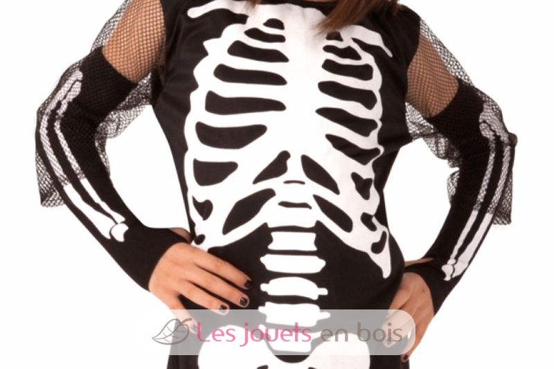 Dieses Kinderkostüm besteht aus einem ärmellosen schwarzen Kleid mit weißem Skelett-Aufdruck, schwarzen Stulpen mit Tüllbesatz und bedruckten Strümpfen.
