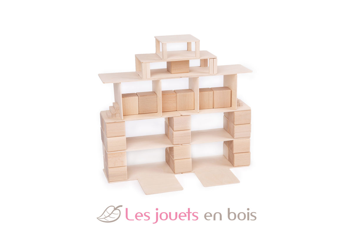 Das Small Pack Just Blocks enthält 74 Holzelemente in 4 verschiedenen Formen: 31 Blöcke, 10 große Teller, 8 mittlere Teller und 25 Stöcke. Ihre Größe und Form wurden sorgfältig durchdacht und ausgewählt, um die motorische und intellektuelle Entwicklung des Kindes zu unterstützen.