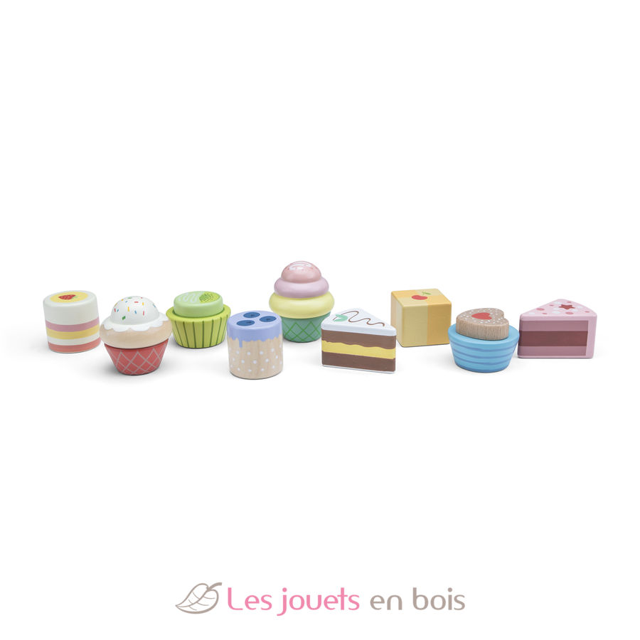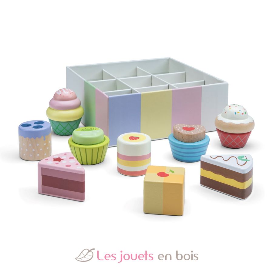 Eine Auswahl von 9 Kuchen und Gebäck aus Holz, präsentiert in einer hübschen Geschenkbox. Ideal zur Vervollständigung eines Kinderspielsets.