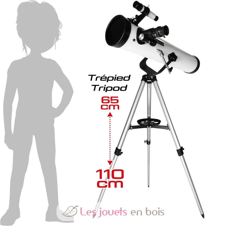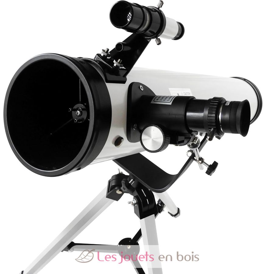 Vollmetall-Tubus. 76 mm Durchmesser und 700 mm Brennweite. Drei austauschbare Okulare inklusive: 20 mm, 6 mm und ein 10-mm-Kellner-Okular. Aluminiumstativ mit zwei Höhenpositionen: 65 cm und 110 cm.