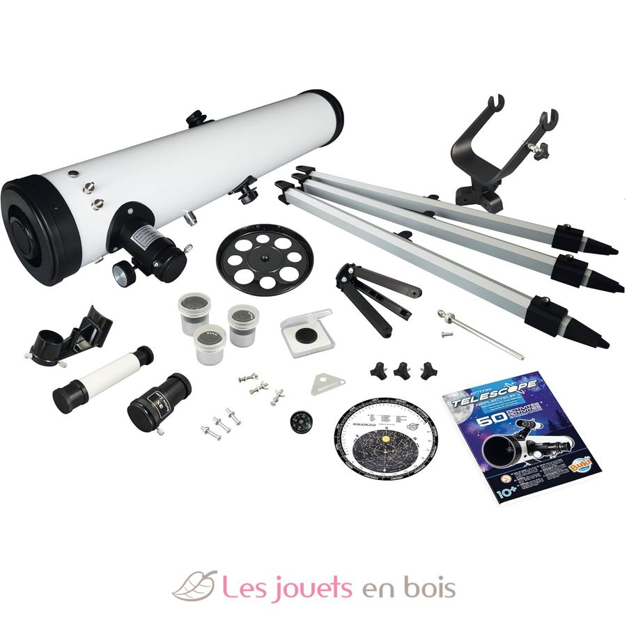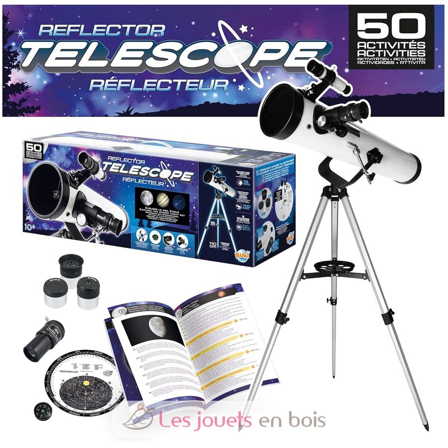 Ein Spiegelteleskop mit einer Anleitung, die 50 Aktivitäten zur Erkundung des Sternenhimmels, der Planeten und der Mondlandschaft bietet.