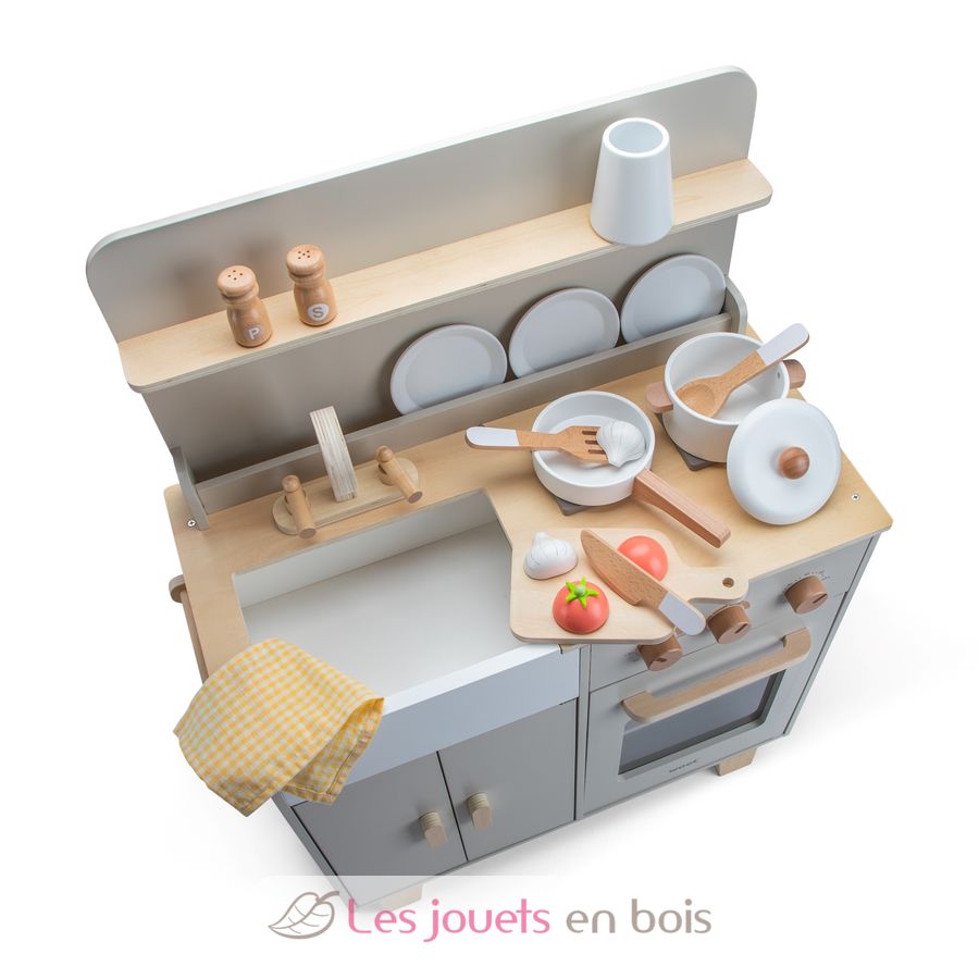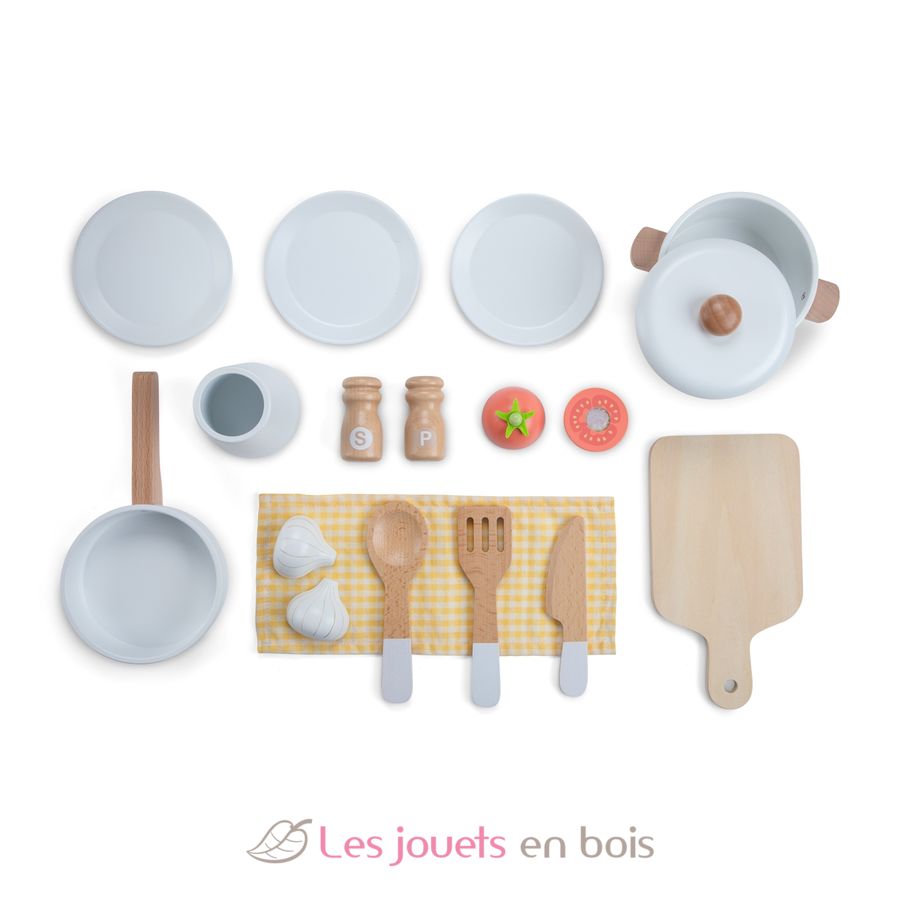 Kleine Köche ab 3 Jahren können damit köstliche Gerichte für ihre Gäste zubereiten. Dafür sorgen die 16 mitgelieferten Holzaccessoires: 3 Teller, 1 Bratpfanne, 1 Topf mit Deckel, 1 Geschirrtuch, Salz- und Pfefferstreuer, 1 Schneidebrett, 1 Tomate, 1 Knoblauchzehe, 1 Messer, 1 Löffel, 1 Pfannenwender und 1 Besteckhalter.