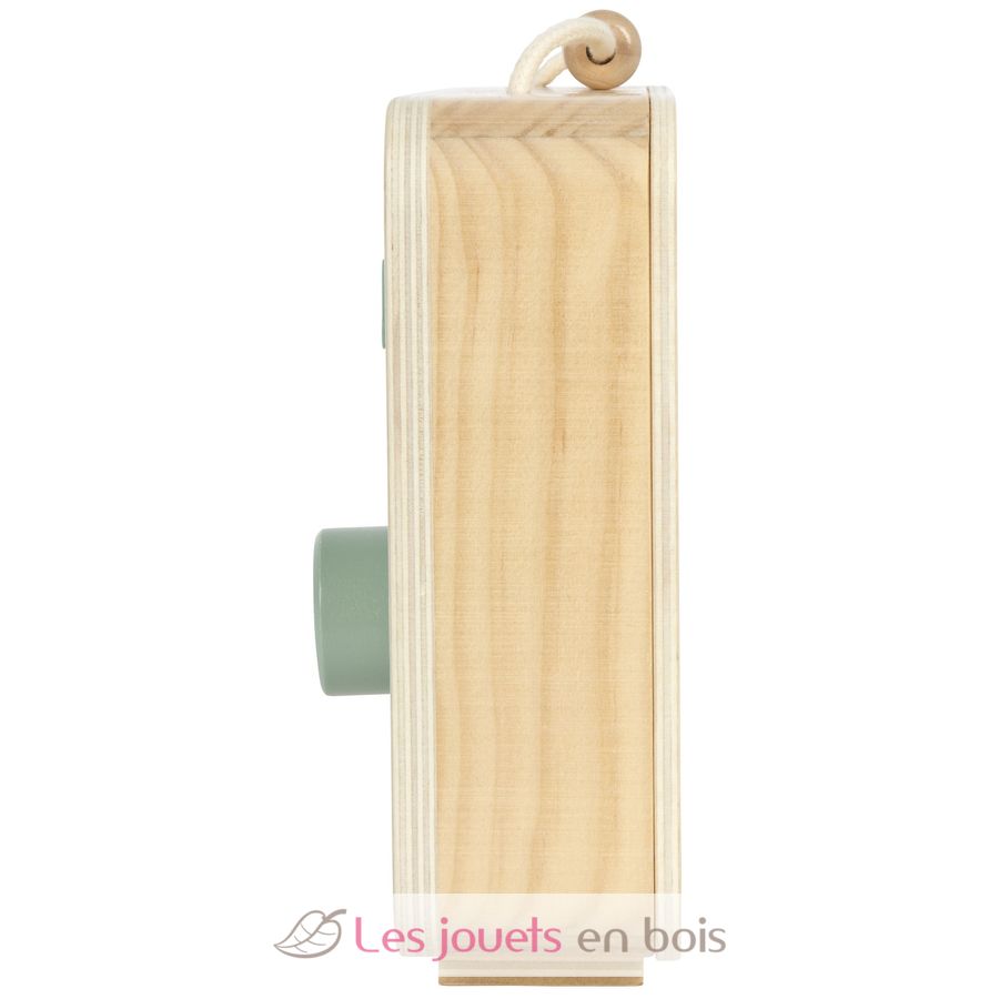 Ein praktischer Griff macht die Spieluhr mobil – perfekt, um sie überallhin mitzunehmen. Die aufgedruckte Uhr mit verstellbaren Zeigern lädt zusätzlich zu ersten Rollenspielen rund um die Uhrzeit ein.