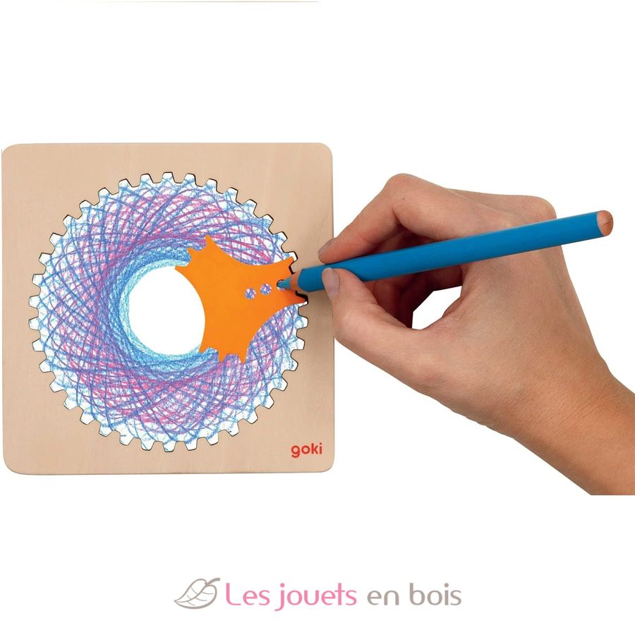 Mit diesem hölzernen Spirographen kann Ihr Kind hübsche Zeichnungen und Rosetten anfertigen. Bestücken Sie es mit einem Bleistift, einem Blatt und los geht's! Um Rosetten und Mandalas zu erhalten, müssen Sie die Spitze Ihres Bleistifts in eines der eingekerbten Stücke stecken und es im Rahmen drehen. Die 5 gekerbten Teile mit unterschiedlichen Löchern ermöglichen die Herstellung unterschiedlicher Rosetten. Ein klassisches Spiel, das die Kreativität von Kindern anregt!