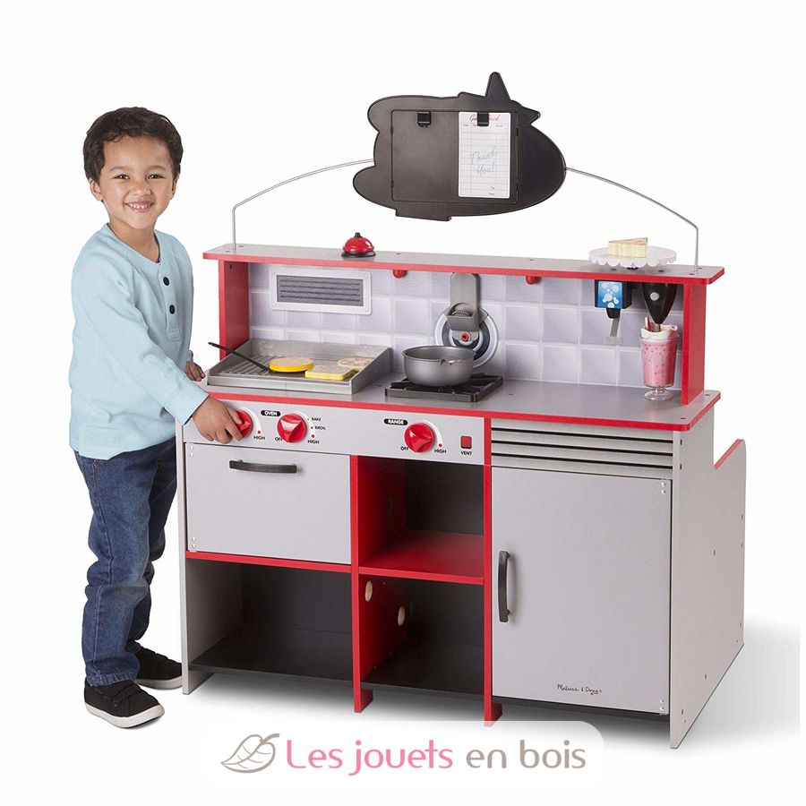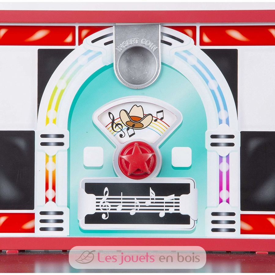 Es macht doppelt so viel Spaß im Star Diner! In diesem robusten, doppelseitigen Spielbereich aus Holz können Kinder von der Küchenseite kochen und servieren sowie auf der Standseite eine Mahlzeit bestellen und genießen. Die Küche mit einem extragroßen Ofen, realistischen Brennern und Anzeigen, einem Kühlschrank mit zwei Regalen und viel Ablagefläche bietet unterhaltsame Details wie einen Getränkeautomaten und einen Milchshake-Maker mit einer Mischstange, die auf und ab bewegt werden kann. An der zweisitzigen Kabine können Kunden ab drei Jahren das Jukebox-Wahlrad drehen, um ihre Lieblingsmusik zu wählen, und dann die mitgelieferte Münze in den Schlitz werfen - und die Münze landet in einem Auffangfach auf der anderen Seite!